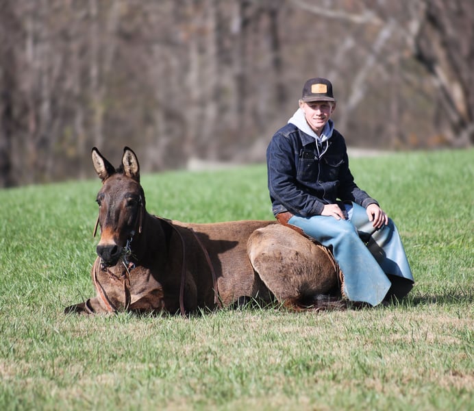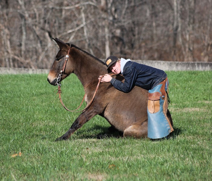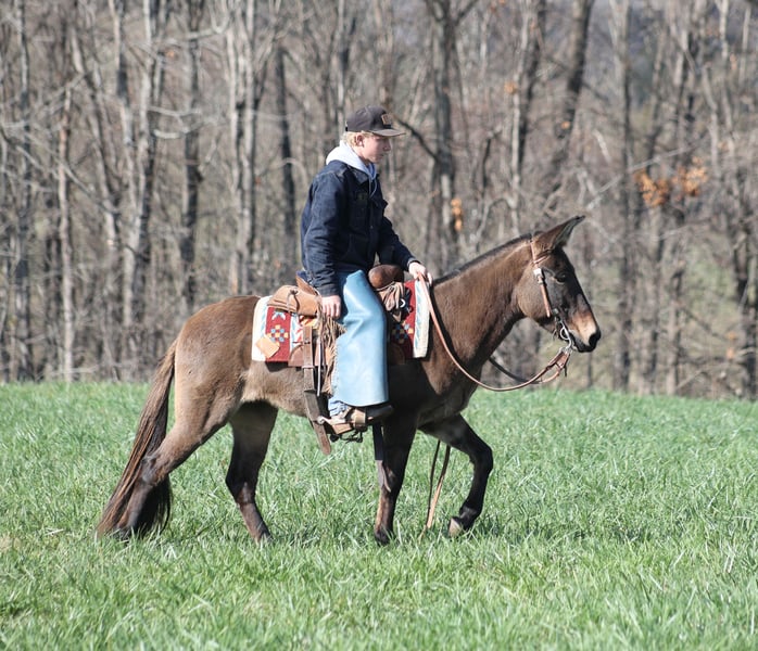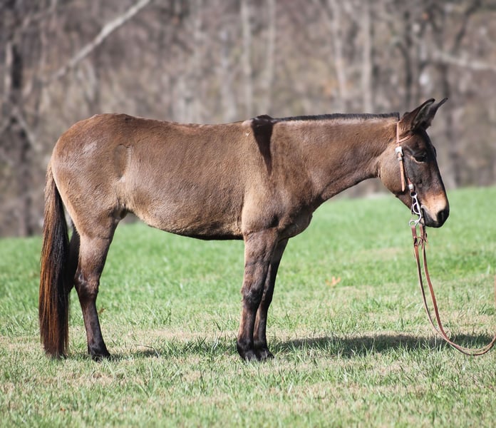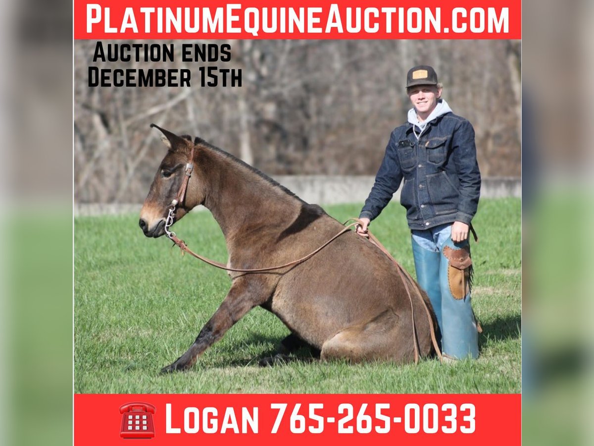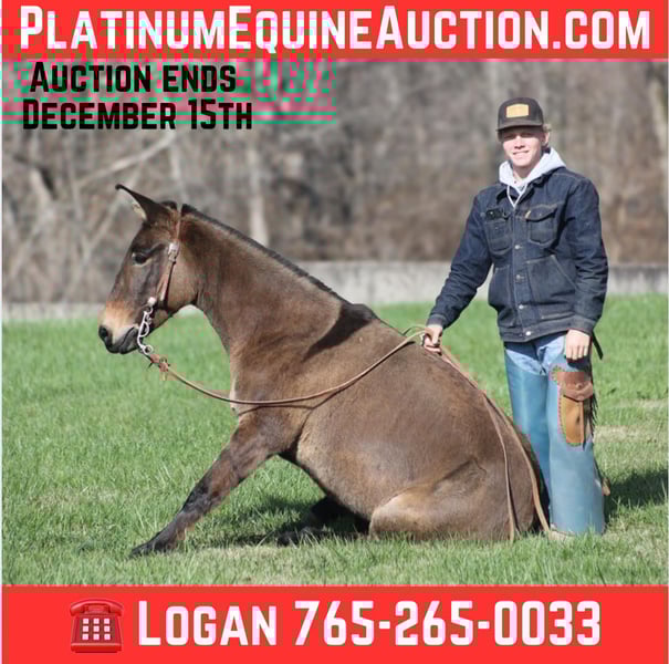 ONLINE AUCTION Place your bids at www.PlatinumEquineAuction.com Starting Bid $3500 Auction ends December 15th, 2024 Need a new saddle? Check out White Rock Saddles on our website or Facebook! Here is one that I’ll bet your neighbor won’t have one like! Meet Shirley Temple! She is a stout built, 13H, 7 year old, Grulla molly/mare mule. Shirley is 100% dependable! Whether she is ridden every day or left in the stall for a couple week or left out in the pasture for a couple months, she will be the same! She is easy to tack up, bridle, handle her feet, just cinch her up and lope her right off, their is no fuss with this gal. Shirley has been ridden by all ages even as young as 6 years old. She is the perfect family mule as she is safe and dependable yet versatile enough to do anything for any member of the family. I have ridden her at night coon hunting, where I have led my dogs, I had squirrel hunted off of her of the day time, used her to check my deer cameras, ride fences around the pasture, herd cattle, we have even roped a couple calves… no matter what the task at hand is, Shirley is going to help you get it done. She has been trail ridden extensively and geos anywhere that a big 16h horse can go (but you won’t bump your head on the tree branches like you will on those big guys), it doesn’t get too steep or too deep! Shirley will climb up the steep hills and slide down the other side if need be. She will scale up big slick rocks and jump off of them as well when asked. She will cross deep water with no issues and takes her time on the rocky terrain as well. The kids have played with her tracking the roping dummy and trotted/loped her around the barrels. Shirley does great in the herd and is also fine being stalled. She is always the first one to the gate to meet you if she is pastured and she loves attention whether that be getting brushed. Shirley lopes nice circles, takes her leads and reins around well. She tacks up and rides off quietly everytime! Shirley knows some tricks, she lays down with ease and enjoys being the center of attention for folks to gather around and pet on her, she also sets as well. Feel free to call Moore Trained Horses Logan 765-265-0033 with any questions or to make a buy it now offer. Located in Level Green, KY. We can set up shipping for a PRE-Christmas delivery to any state. ONLINE AUCTION Place your bids at www.PlatinumEquineAuction.com Starting Bid $3500 Auction ends December 15th, 2024 Need a new saddle? Check out White Rock Saddles on our website or Facebook!