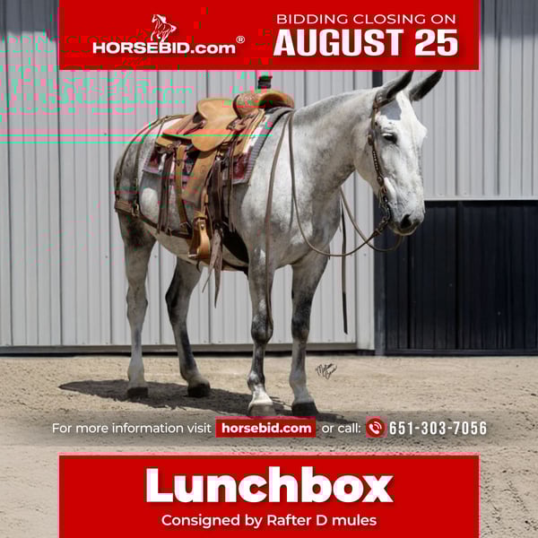 ⭐️ 𝐀𝐔𝐆𝐔𝐒𝐓 𝓐𝓵𝓵 𝓢𝓽𝓪𝓻 𝓛𝓲𝓷𝓮𝓾𝓹 ⭐️ Happening now thru MONDAY | AUGUST 25th - Available EXCLUSIVELY on HorseBid's website! For more details and to register visit: www.Horsebid.com CONSIGNOR CONTACT: Rafter D mules 651-303-7056 LOCATION: Hastings MN BREED: Mule REGISTERED: No COLOR: Gray HEIGHT: 15 AGE: 9 GENDER: John Mule Lunchbox is a very cool calm mule. That is the perfect size standing 15 hands and is very thick built!! He stands for mounting and dismounting. This guy is easy to catch and loves people. He enjoys being brushed and getting scratched all over. Has a very LOVING personality. Lunch box is a finished trail and mountain mule that has been up and down lots of mountain passes. He will pack anything you can load on him. Horns/meat/camp supplies anything you want. We also love riding him on the trails and in the arena. He is super safe and will ride it out alone or just fallow along with the group. We have had all levels of riders enjoy riding him. He gentle all the time. He is great with time off. This mule is going to make someone very happy when you get him home. We welcome you to come to the ranch to try him out. He is a very special mule.