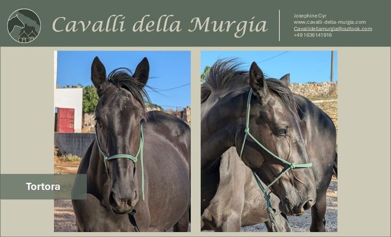 Tortora est une jument murgesenne née en 2023, issue de l’élevage de Giuseppe et Domenico Amatulli. Elle se trouve actuellement à Martina Franca, en Italie, où elle vit en troupeau. Ce qui la distingue, c’est sa douceur particulière et son attention envers l’humain. Elle est déjà manipulée avec un licol et se montre calme et coopérative dans ses interactions. Vous êtes intéressé(e) par Tortora et souhaitez la rencontrer en personne ? Actuellement, elle reste dans sa région natale, en Pouilles, chez son éleveur. Nous serons ravis de vous aider à organiser une visite sur place. Tortora est proposée par Cavalli della Murgia. Sur demande, nous pouvons fournir des radiographies ainsi que d’autres photos et vidéos. Nous prenons également en charge l’intégralité de la transaction, y compris la visite vétérinaire (AKU) et le transport vers l’Allemagne. Vous avez d’autres questions ? N’hésitez pas à nous envoyer un e-mail à cavallidellamurgia@outlook.com. Nous attendons votre message avec impatience.
