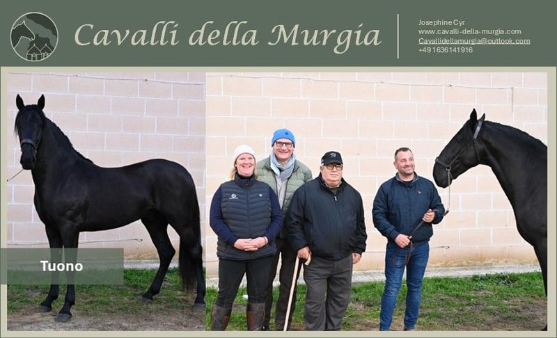 Tuono ist ein eher ruhiger und seriöser Junghengst, der bereits bei der Junghengstkörung seine Qualität unter Beweis gestellt hat. Unter rund 120 Konkurrenten belegte er in der Kategorie der 30 Monate alten Junghengste den zweiten Platz. Mit einem Stockmaß von 161 cm und einem Preis von etwa 10.000€ präsentiert sich Tuono als vielversprechender Partner für die Zukunft – sei es in der Zucht oder im Freizeitbereich. Vollgeschwister können ebenfalls besichtigt werden, was einen zusätzlichen Einblick in die Qualität und Charakter der Linie ermöglicht. Tuono befindet sich aktuell beim Züchter in Apulien, Italien. Tuono hat Ihr Interesse geweckt und Sie möchten ihn gerne persönlich kennenlernen? Aktuell steht Tuono noch in seiner Heimat, Apulien bei seinem Züchter. Wir helfen Ihnen sehr gerne, einen Besuch dort zu planen. Tuono wird durch Cavalli della Murgia vermittelt. Röntgenbilder sowie weitere Bilder und Videos stellen wir gerne auf Anfrage zur Verfügung. Die komplette Kaufabwicklung inklusive AKU und Transport nach Deutschland wird ebenfalls von uns organsiert. Haben Sie noch Fragen? Schreiben Sie uns gerne ein Mail - cavallidellamurgia@outlook.com. Wir freuen uns auf Ihre Nachricht.