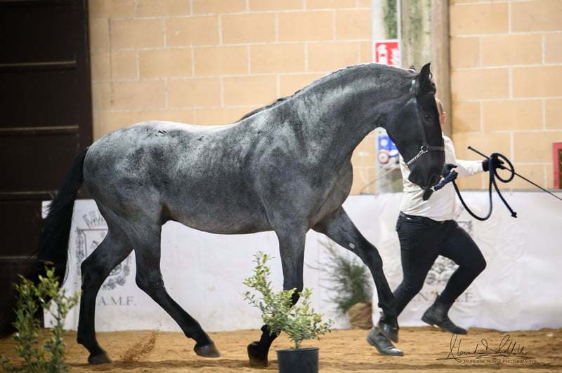 Tango di Farinella is a young Murgese stallion of exceptional quality, approved for breeding with the highest rating: Class A. This achievement makes him unique, as he is the only roan son of Paisiello to have received this distinction, confirming his exceptional phenotype and morphology. Standing at 16.1 hh (with potential for further growth), Tango presents as a very elegant, harmonious horse with lively, expressive movements. His temperament is fundamentally good, but Tango is a horse with a strong personality: lively, curious, and full of energy. He requires an experienced handler familiar with stallions. A rare opportunity for those seeking a horse of bloodlines and quality.