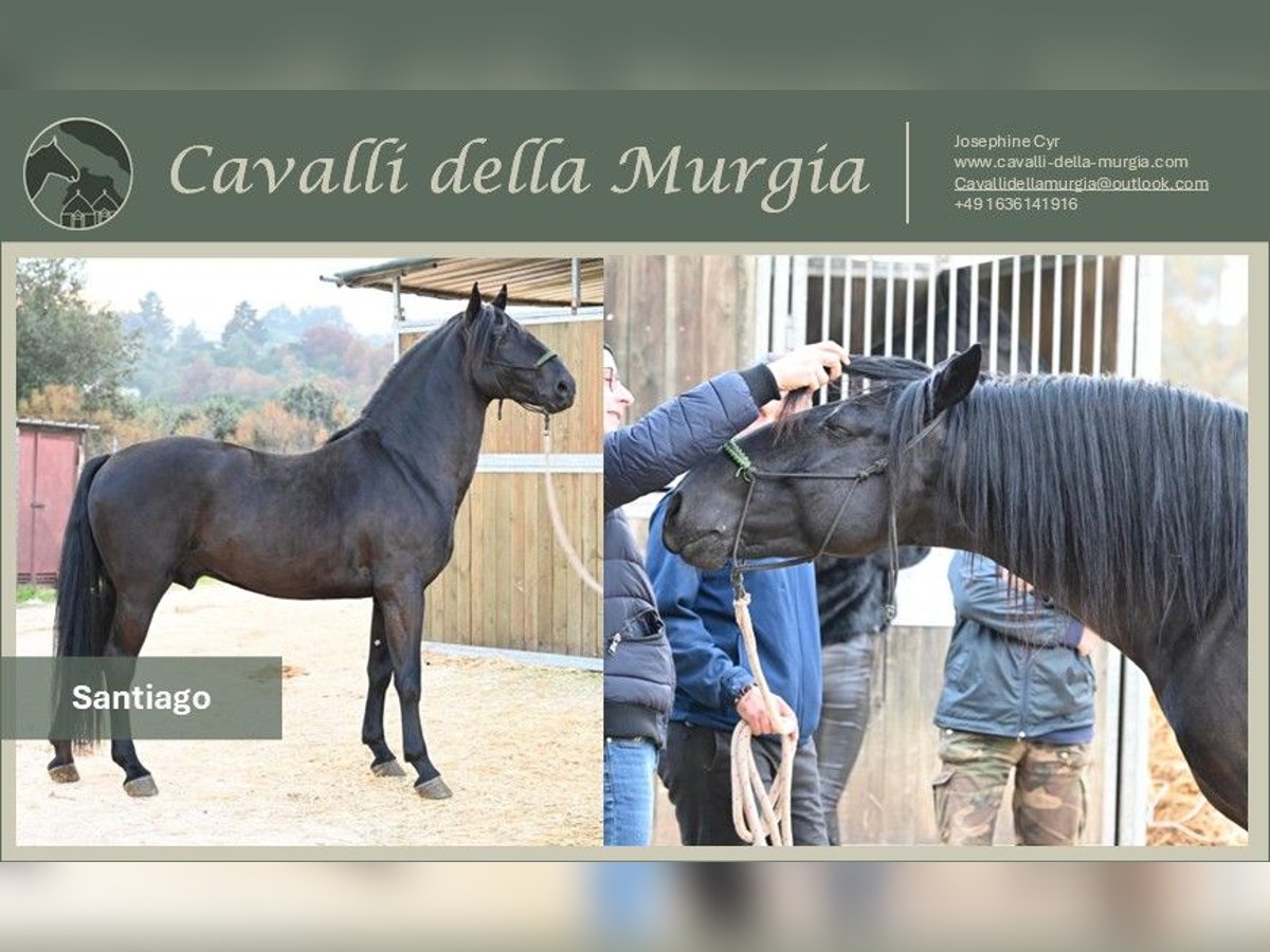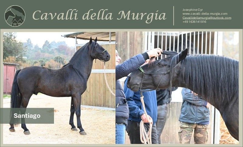 Né en 2022, Santiago mesure 1,56 m et provient de l’élevage renommé de la famille Ricci (Vallenza). Il profite actuellement du soleil de sa région natale, l’Apulie, en Italie. Ce cheval exceptionnel sait parfaitement ce qu’il a à offrir : il est conscient de sa beauté et impressionne par sa prestance souveraine, stable et confiante. Santiago est un cheval avec de la personnalité – non seulement un véritable point d’attraction visuelle, mais aussi par sa présence, un véritable regard captant. Vous êtes intéressé par Santiago et souhaitez le rencontrer en personne ? Nous serons ravis de vous aider à organiser une visite. Santiago est proposé par Cavalli della Murgia. Des radiographies ainsi que d’autres photos et vidéos sont disponibles sur demande. Nous prenons également en charge l’ensemble de la transaction, y compris la visite vétérinaire (AKU) et le transport vers l’Allemagne. Vous avez d’autres questions ? N’hésitez pas à nous envoyer un e-mail à cavallidellamurgia@outlook.com. Nous attendons votre message avec impatience.