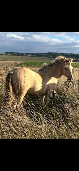 Silver was born in January. He is growing up robustly in the herd. Daily play helps develop muscles, endurance, and lung capacity. It also trains his balance and condition. He is a cheerful and brave stallion who is not easily thrown off his inner balance. His strong and correct foundation leaves nothing to be desired. His bright golden color makes him a real eye-catcher. The two-colored mane and tail complete the picture.