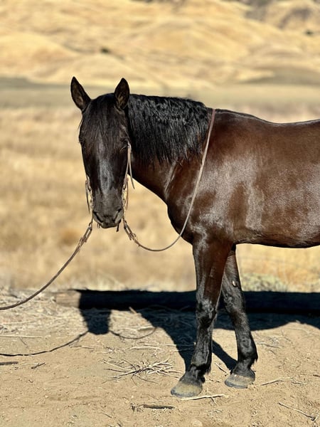 ONLINE AUCTION Place your bids at www.PlatinumEquineAuction.com Starting Bid $3500 Auction ends December 1st, 2024 Need a new saddle? Check out White Rock Saddles on our website or Facebook! Cuervo is a 10yr old titled BLM mustang off the Stone Cabin, NV HMA. He stands 14.2HH and has thick bone and a strong build. When I tell you, you won’t find a better trail stead I mean it! Cuervo is an absolute blast to ride long rides with your friends, or adventure alone. Being raised out in the steep terrain he is the epitome of sure footed and SAFE! He will travel through literally anything and never take a wrong step. He navigates through steep drops, rushing rivers, tree limbs, and rocks like a dream. Cuervo loves to go explore and always is the best mannered guy. He can lead the pack, stay in the middle, follow up the hind, or venture off alone and he will be content in any situation. Nothing phases him, he stays sane and quiet in all scenarios. We have carried flags, gone over tarps, and he is a natural pro at the trail course obstacles. Cuervo never refuses, or bocks at anything. He is the most willing, calm minded horse I have ever been around. We have also exposed him to roping and cattle and he has taken a liking to it and shows promise! He respects leg pressure, has the lightest touch neck rein handle, knows his leads and has pretty circles in the arena. He has an easy stop and reverses with light pressure. This guy can be left off and never change his sweet calm demeanor. He has no spook, no buck and no bolt making him a choice for any level rider. Cuervo always stands patiently tied for tacking, grooming and bathing. He will let you clip every hair on his body, face and ears no problem. Cuervo stands amazing for the farrier and has GREAT solid black feet that are easily maintained. He can load up in the trailer all by himself and back out easily. He’s been pastured with multiple horses or stalled alone. He doesn’t get buddy OR barn sourness. Cuervo is the definition of fun, safe and sane! If you’re a person wanting to be competitive in trail versatility competitions this is the guy for you! He would also accommodate anyone just wanting to maximize their joy of riding! We know you’ll love Cuervo just as much as we do! For any more information, please contact Cheyenne Rey 831-537-8746. He is located in Bitterwater, CA. ONLINE AUCTION Place your bids at www.PlatinumEquineAuction.com Starting Bid $3500 Auction ends December 1st, 2024 Need a new saddle? Check out White Rock Saddles on our website or Facebook!