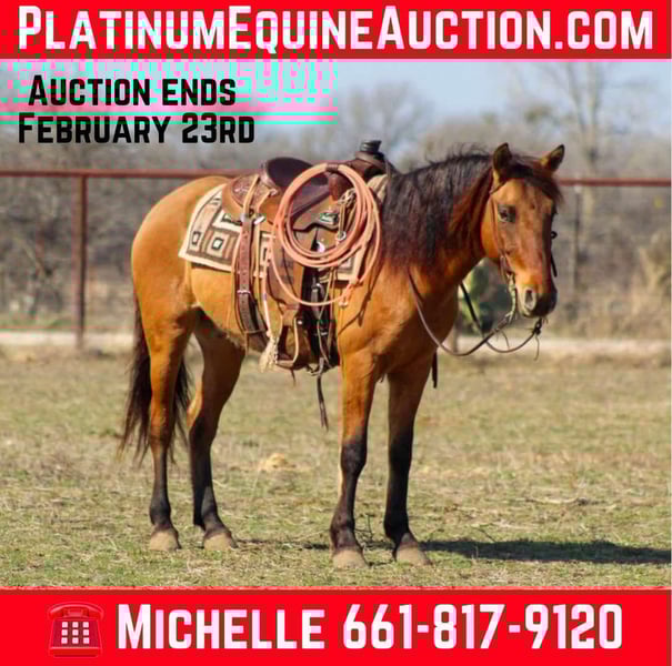 ONLINE AUCTION Place your bids at www.PlatinumEquineAuction.com Starting Bid $3500 Auction ends February 23rd, 2025 Need a new saddle? Check out White Rock Saddles on our website or Facebook! Here’s your chance to own a piece of American history! Meet Benji, a charming 2019 dun BLM branded Mustang gelding standing a perfect 14 hands tall. He was gathered from the Eagle HMA in Nevada and is the epitome of cowboy cool! Benji has an impressive resume, having competed in the mustang makeover with his previous owner, who did a fantastic job training him. He’s participated in extreme trail challenges, showcasing his ability to navigate all sorts of obstacles with ease. He has been day worked on doing all the ranch chores including roping sick cattle outside, Benji is always up for the task. He’s been used to gather and load trucks at the sale barn, proving he’s as versatile as they come! With an extremely nice handle, Benji keeps his head low whether we’re in the arena, on the trails, or at the ranch. He has a quick, smooth walk that can cover ground when you need it. He’s been ridden to town countless times and doesn’t flinch at semi-trucks zooming by or heavy traffic. Benji is a joy to ride on trails, where his sure-footedness and keen awareness keep everyone safe. He’s seen miles and miles of diverse trails and thrives in rough country—it just comes naturally to him. Not only is he well-broke for trail rides, but he’s also ready to shine at ranch horse shows, especially in the mustang classes. In the arena, he walks, trots, and lopes circles with ease, demonstrating great transitions and a willingness to lope right out of your hand. Benji is super sweet and absolutely loves being loved on! He’s great with tarps and flags, and he’s even participated in local town parades. Recently, we’ve started pen roping calves on him, and he’s shown all the buttons and ability to become a standout breakaway horse. With a natural instinct for cattle, he truly enjoys working and roping. Don’t miss the chance to watch his video and see just how amazing and versatile Benji is. He’s ready to be your new equine partner! Contact us to come try him, or we can set up a FaceTime as well! M $ Performance Horses Michelle 661-817-9120 If you need help with transport don’t hesitate to ask we have a list of reputable haulers that can get him safely to your doorstep WORLD WIDE including, Alaska , Mexico, Hawaii and Canada. ONLINE AUCTION Place your bids at www.PlatinumEquineAuction.com Starting Bid $3500 Auction ends February 23rd, 2025 Need a new saddle? Check out White Rock Saddles on our website or Facebook!