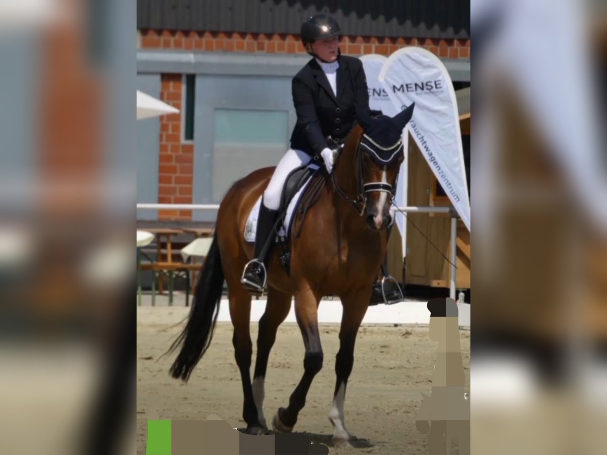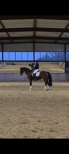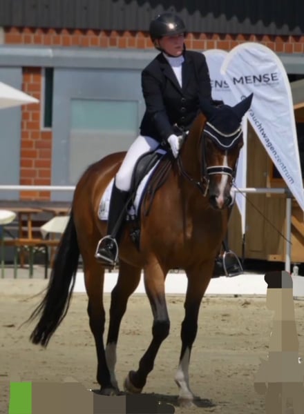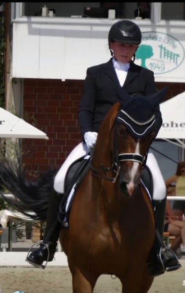 Zum Verkauf steht eine braune Stute, geboren 2010, ca. 1,66 m groß. Sie ist ein äußerst sitzbequemes, komfortables Reitpferd, das sich jederzeit fein und leicht reiten lässt. Eine sensible, ehrliche Stute mit viel Herz für ihren Reiter. Die Stute ist dressurmäßig M-sicher ausgebildet, S-Lektionen sind bereits begonnen und vorbereitet. Sie war in Dressurpferdeprüfungen der Klasse A und L siegreich und platziert. In M-Dressuren wurde sie bereits vorgestellt und war dort erste Reserve. Alle Lektionen sind sicher abrufbar, weshalb sie sich auch sehr gut als Lehrpferd eignet. Sie geht brav ins Gelände, kennt Straßenverkehr, springt kleine Geländehindernisse, geht durch Wasser und wurde regelmäßig für lockeres Galopptraining genutzt. Mit einem Reiter, dem sie vertraut, meistert sie das alles ruhig. Ideal wäre ein Zuhause mit direktem Zugang ins Gelände. Sie ist sehr sensibel und feinfühlig und bringt ein kleines Manko mit: In vollen Reithallen oder auf engen Abreiteplätzen bekommt sie etwas Platzangst. Sie bleibt dann stehen oder wird unsicher, wird dabei aber niemals böse (kein Bocken, Steigen oder Losrennen). Mit Ruhe, Gefühl und Ausweichmöglichkeiten lässt sich das gut managen. Ein ruhiger Stall mit überschaubarem Pferdebestand, Ausweichmöglichkeiten oder eigenem Reitplatz/ Reithalle, sowie täglichem Auslauf (Weide/Paddock) wäre perfekt. Turniere sind möglich, sollten aber gezielt ausgewählt werden. Ein Pferd für einen gefühlvollen, erfahrenen Reiter, der ihr Sicherheit gibt. Ideal z. B. für ein Mutter-Tochter-Duo oder zwei Freundinnen, bei denen eine Person erfahrener ist. In den richtigen Händen ist sie ein absolutes Herzenspferd: leistungsbereit, ehrlich und sehr menschenbezogen. Ich habe sie bis zu diesem Ausbildungsstand gefördert und möchte mich nun meinen jungen Pferden widmen. Wenn du ein fein ausgebildetes, sensibles Dressurpferd für den gehobenen Freizeitsport suchst und ihr passende Rahmenbedingungen bieten kannst, ist sie vielleicht genau dein Traumpferd.