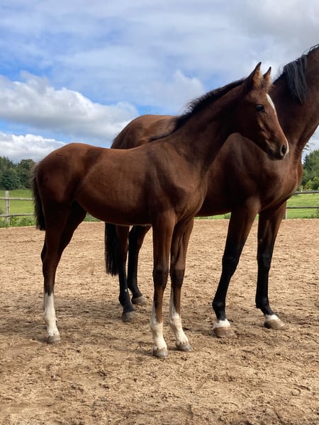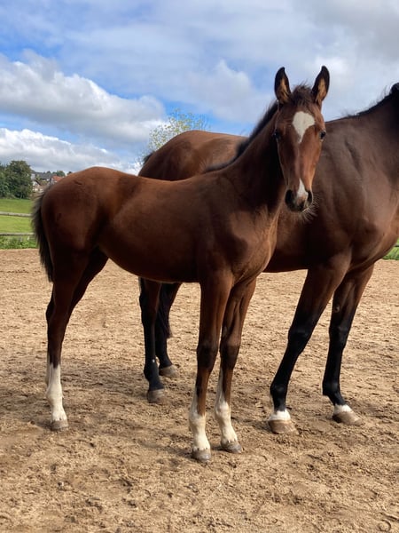 For Sale: German Sports Horse A promising mare, a German sports horse born in 2025, is available. She features an elegant bay coat and has an approximate final height of 16.1 hh. This mare is particularly well-suited for show jumping. Her friendly and outgoing nature makes her an ideal partner for riders seeking a reliable and high-performance horse. She has an impeccable character and excellent conformation. If you are interested or would like more information, please feel free to contact me. Don’t miss the opportunity to acquire a talented horse with great potential for the future!