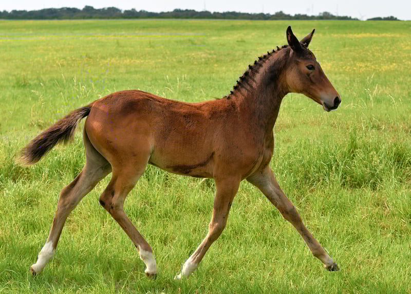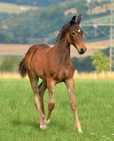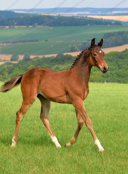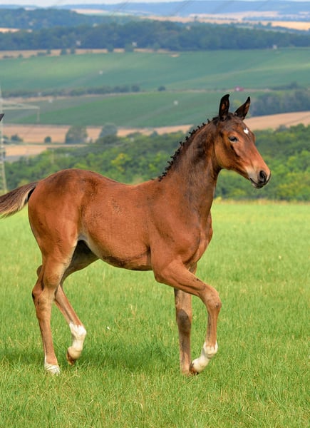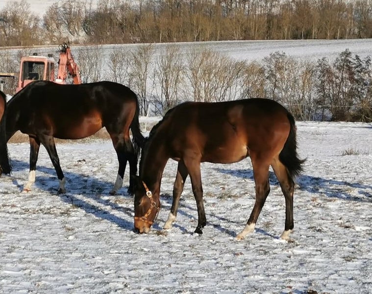 Zum Verkauf steht eine typvolle braune Jährlingsstute von Moritzburger Hengst Cassoulet aus einer Trakehner Stute von Saint Cyr x Aristo. Sie wächst derzeit in einer gemischten Herde auf. Ist schmiedefrom und halfterführig. "Sie präsentierte sichzur Fohleneintragung rassetypisch mit femininer Ausstrahlung, geprägt von einem ausdrucksstarken Gesicht, klarem Auge und harmonischem Seitenbild. Im Gebäude ist ein gutbemuskelter trockener Hals hervorzuheben, sowie eine schöne schräggelagerte Schulter, wodurch sie trotz ihres leicht überbauten entwicklungsbedingten Formates, sich trotzdem elastisch durch den Körper bewegt und dennoch natürliche Bergauftendenz zeigt. Auch der Galopp ist hervorzuheben mit einer gut durch den Körper gesprungenen Galoppade und einem aktiven Hinterbein. Insgesamt ein gelungenes Stutfohlen mit Ausdruck, klarem Fundament und Bewegungsqualität." Die Bewertung zur Fohleneintragung: Typ: 9 Gebäude: 8 Bewegung: 8 Der Vater CASSOULET ist Prämienhengst und vereint in seinem Pedigree Leistungsgenetik für höchste Ansprüche. Dies wird durch die springbetonte Endnote von 8,65 im 30-Tage-Test bestätigt. Die Mutter KATE stammt aus der Kayleen (Trakehner Stutenlinie der Kassette 690 (T7A1 Kassandra)). Diese Linie ist bekannt für die Vererbung von Leistungsbereitschaft, Rittigkeit und Härte. Bei Fragen und zum Anschauen gerne melden.