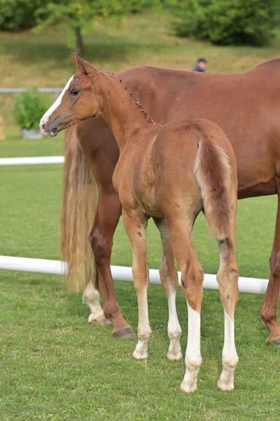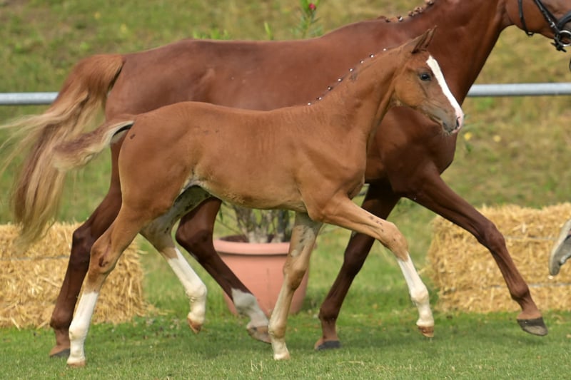 **Sales Advertisement: German Sport Horse – Mare** For sale is a promising filly from the breeding year 2025. She is an elegant chestnut with four white legs, impressing with her appealing charisma and harmonious appearance. She is GOLD awarded and achieved an outstanding 4th place in the finals at the Birkhoff Foal Championship. Furthermore, there are several half-siblings that are very successful in sports. This talented mare is ideally suited for dressage. Her friendly nature and willingness to learn make her an ideal partner for ambitious riders who want to make a breakthrough in dressage in 3 years. She is well-mannered, easy to handle, and in excellent health. The mare is halter-trained, knows how to load in a trailer, and is familiar with the farrier. If you are interested or have any further questions, please feel free to contact me. Visit us and see for yourself this wonderful foal!