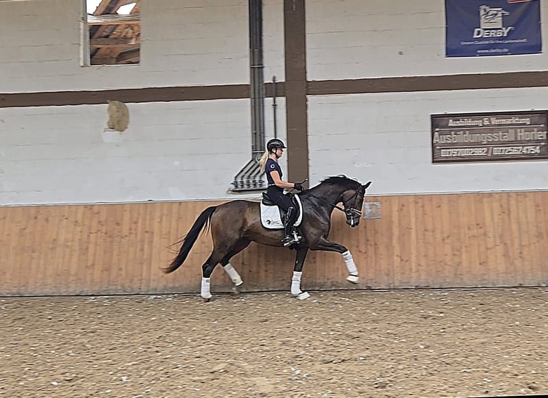 Piękna 3-letnia klacz po So Perfect x Fürstenball. W codziennym obcowaniu jest bezproblemowa i urocza. Dobre podstawowe chodzenie, miękka w pysku, wrażliwa na nogi, co zapewnia jeźdźcowi wspaniałe uczucie podczas jazdy. Dobry przegląd techniczny dostępny, około 169 cm. Zna pastwisko, paddock, lonżownik, wolne skoki. Można ją wypróbować w jeździe w 97285 Röttingen. Proszę dzwonić tylko pod numer 0179 700298 lub 015117238135.