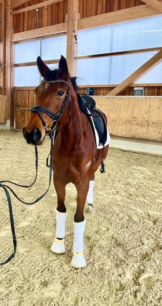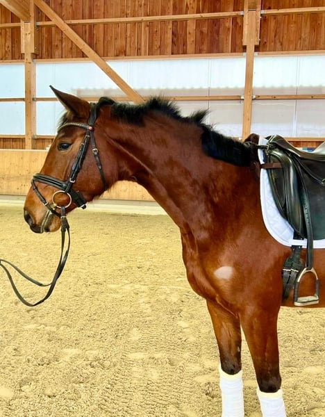 Stute springbetont -Nachwuchspferd aus 2022 Diese motivierte springbetonte Stute besticht durch ihre Arbeitseinstellung und ihre unkomplizierte Art. Callina ist altersgemäß schonend und gut angeritten, fein in der Hand und überzeugt unterm Reiter bereits bei kleinen Sprüngen. Sie meisterte die ersten Sprünge mit viel Übersicht und Go. Sie hat keinerlei Unarten wie Buckeln, Steigen oder Schlagen und ist stets gut aufgelegt und lernwillig. Geeignet ist sie für den Springsport, Gelände oder als unkomplizierter Freizeitpartner. Mehr. Sie ist äußerst menschenbezogen, schmiede- und verladefromm. Ideal für Reiter, die ein talentiertes Pferd suchen, ohne Unarten, das sowohl im Training als auch auf dem Turnierplatz glänzt Wichtige Hinweise: • gute Röntgenbilder ohne Risikobefund inkl. Rücken liegen vor. Ein Probereiten ist jederzeit möglich, eine Reithalle ist vorhanden. Bei Interesse oder für weitere Informationen stehe ich gerne zur Verfügung: Telefon: 08531 3102826 oder 0171 6087030 -
