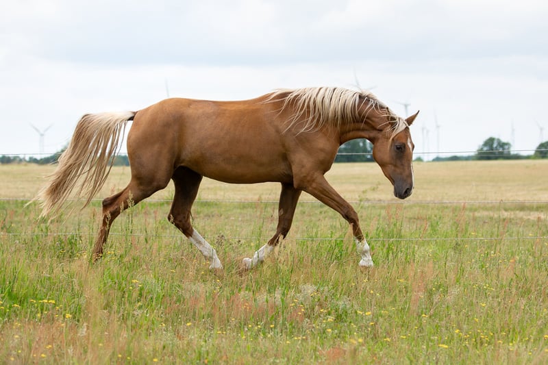 Carrie Forbes, alias "Furby," combines an excellent range of movement with an absolutely stunning color (dark palomino). She was born on our farm, grew up robustly in a mixed-age herd, and is now gradually ready for more advanced tasks. Her sire, Belvedere, a son of Belissimo, achieved a top-ten placement at the World Championships for Young Dressage Horses with Stefanie Wolf and later moved to the USA, where he is trained by Nick Wagman. Wagman considers him a potential candidate for the 2028 Olympic Games in his home country. Furby's dam, Cortess, produced numerous champion foal candidates, including the state premium mare Calamity Jane by Bonds, who placed 4th in the dressage-oriented mare foal class at the German Foal Championship in Lienen and qualified for the Bundeschampionat at three years old. Furby is an alert, ambitious mare with a strong drive for sport, which is why we wish to place her in knowledgeable, supportive hands. She is also highly interesting for breeding, as she passes on her lightening cream gene 50% of the time, enabling the breeding of Palominos and Buckskins.