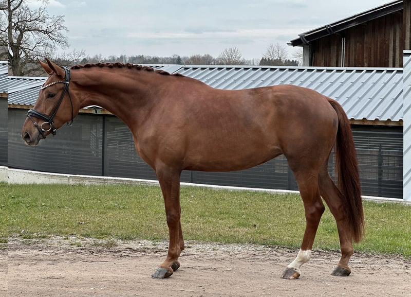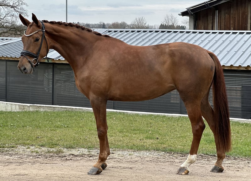 Geschlecht: Stute Alter: 4 Jahre Stockmaß: ca. 1,72 m Abstammung: Danciero x Bordeaux AKU: Röntgenbilder vorh. Standort: GESTÜT SCHORER, Frankenhofener Str. 3, 86860 Weicht Zum Verkauf steht eine außergewöhnlich interessante vierjährige Stute von Danciero x Bordeaux. Mit ihrem modernen sportlichen Typ und ihrer überdurchschnittlichen Grundgangarten und ihrer natürlichen Rittigkeit ist sie sowohl für ambitionierte Amateure als auch für Profis eine echte Empfehlung. Genetisch ist sie hochinteressant: Danciero – aktuell einer der begehrtesten Hengste seiner Generation und Bordeaux, ein bewährter Vererber mit starker Rittigkeitsveranlagung. Damit ist die Stute züchterisch ebenso spannend wie sportlich. Diese junge Stute überzeugt jeden Tag mit ihrem super lieben, extrem unkomplizierten und unerschrockenen Wesen. Sie ist: • sehr brav und zuverlässig im Umgang, • menschenbezogen, • unerschrocken, • einfach im Handling • und sozial absolut problemlos mit anderen Pferden. Unter dem Sattel zeigt sie sich leicht zu reiten, mit deutlich spürbarer Rittigkeit und einem tollen Arbeitseifer. Trotz ihres jungen Alters ist sie bereits sehr angenehm zu bedienen und macht es ihrem Reiter leicht. Die Stute ist altersgemäß angeritten und kennt bereits: • Reiten in der Halle, • auf dem Platz, • Ausreiten ins Gelände. Sie wurde noch nicht auf Turnieren vorgestellt, hat aber alles, um jetzt in eine erfolgreiche Saison zu starten. Sie ist aufgrund ihres Alters noch grün, aber zeigt sich hochmotiviert, klar im Kopf und stets bemüht, alles richtig zu machen. Bei der Ankaufsuntersuchung wurde ein Chip gefunden, der operativ problemlos entfernt werden kann. Aufgrund dieses Befunds wird sie deutlich unter Wert abgegeben. Der Chip beeinträchtigt sie momentan nicht im Reiten und ist chirurgisch gut behandelbar. Wir suchen ein liebevolles, langfristiges Zuhause für dieses Nachwuchstalent. Jungpferde-erfahrene Hände sind wünschenswert, aber kein Muss – durch ihr unkompliziertes Wesen ist sie auch für weniger erfahrene Reiter sehr gut händelbar. Eine sportliche Förderung würde uns freuen. Diese Stute ist ein Top-Nachwuchspferd mit hervorragendem Pedigree, starken Grundgangarten, bester Rittigkeit und einem tollen Charakter. Zucht & Sport – beides absolut denkbar! Eine seltene Gelegenheit, ein so gut gezogenes und talentiertes Pferd zu einem deutlich reduzierten Preis zu erwerben. GESTÜT SCHORER Lisa-Maria Klössinger: 0160 977726106