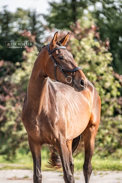 For sale is a well-behaved 4-year-old mare from a dam line with a lot of bloodlines. She has been kept in a species-appropriate manner with plenty of turnout (in winter, daily paddock time of at least 10-12 hours, and in the summer months, 24-hour pasture access) and has been handled daily. The sire, El Salvador, a state stallion at the Moritzburg State Stud, is a competition-successful descendant of Escolar and Sandro Hit. He is paired with a dam line that has Thoroughbred connections. This beautiful and spirited mare would certainly also be suitable for eventing. The mare is currently lunged and is familiar with a rider's weight at the walk.