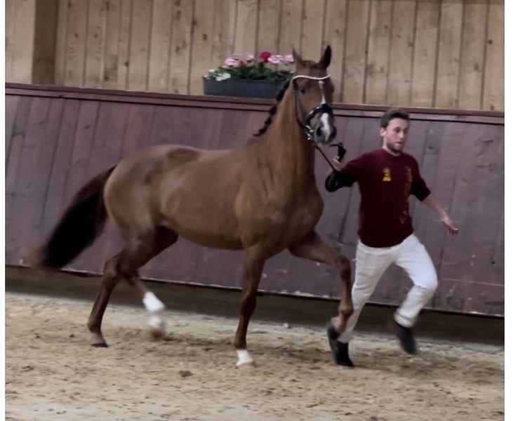 Direkt vom Züchter wird diese wunderschöne deutsche Sportstute angeboten. Die elegante Fuchsstute überzeut durch ihre ansprechende Erscheinung und ihr vielversprechendes Potenzial im Dressursport. Sie wurde schonend ausgebildete und hatte bereits ein Fohlen. Dreijährig legte sie ihre Stutenleistungsprüfung ab und wurde auf der Landesschau mit der Staatsprämie ausgezeichnet. Sie besitzt drei sehr gute Grundgangarten , einen federnden Trab, Galopp mit Lastaufnahme und einen Schritt der durch den Körper geht. Sie bockt nicht, steigt nicht, und ist auch sonst sehr liebenswert und angenehm im Umgang. Ein Pferd für den gehobenen Dressursport ebenso wie für den ambitionierten Freizeitreiter. Aus Zeitmangel wurde sie noch nicht öffentlich am Turnier vorgestellt. L- Lektionen im Anfangsstadium mit einer positiven Arbeitseinstellung. Guter Tüv liegt vor.