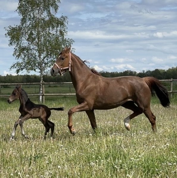 Directly from the breeder, this gently trained mare has already foaled. She completed her mare performance test at age three and was awarded the State Premium at the regional show. She possesses three very good basic gaits, a springy trot, a canter with good impulsion, and a walk that flows through her body. She is not spooky, does not buck or rear, and is very sweet and easy to handle. An ideal horse for high-level dressage as well as for the ambitious leisure rider. Due to lack of time, she has not yet been presented publicly at competitions. She is in the early stages of L-level dressage training but always participates positively.