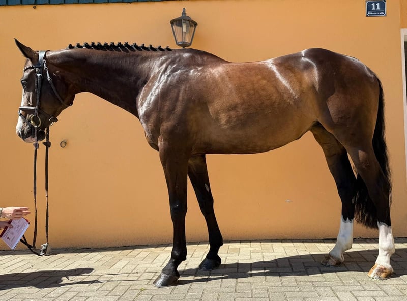 6-year-old mare Clooney x Acords Champion x Landlord x Fantast. Her mother was ridden, trained, and placed up to 140 cm by an amateur rider, with a win at 135 cm. She has received the DSP Sport premium. Looney herself was placed twice at her first competition start in the 4-year-old jumping horse class A with a score of 8.2, under an amateur rider. She is currently placed up to 120 cm and has won in the jumping class L with a score of 8.4. She has competed multiple times in young horse classes at 115 cm and standard 115 cm, all clear, with wins and placements. Very pleasant to ride in dressage, with excellent reflexes, plenty of go, lively, high course intelligence, and brave. Current X-rays are available without any findings of risk.