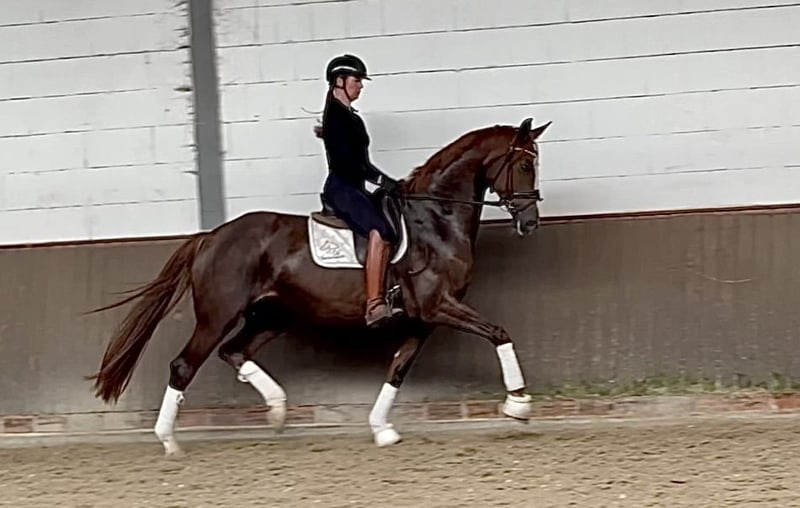 Dear prospective buyers, For questions or to schedule an appointment, please send us a WhatsApp or email. You can reach us by phone on weekdays, preferably around noon. If that doesn't work, just drop us a message, and we will get back to you. We look forward to hearing from you! “Franzi” is a high-quality, very eye-catching, and rideable young dressage prospect, with all paths open for sport in the large arena. She knows how to capture everyone's heart with her charming nature and loving character, and she is incredibly easy and uncomplicated to work with under saddle. She already performs beautiful canter and canter-walk transitions and learns newly presented tasks quickly and intelligently. From her mother, we have already had several offspring under saddle, all of whom impress with their high rideability and impeccable character, and are competing in dressage with great quality in supportive hands. She is also very well suited for a less experienced rider. A mare with the absolute wow factor and a heart of gold! Good vet check available. Directly from the breeder.
