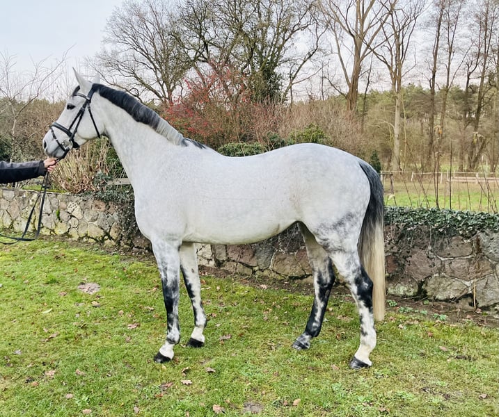 For sale is this 8-year-old grey mare by Kasanova de la Pomme out of Coupe D’Or. The mare has competed successfully in show jumping up to 115 cm and has achieved placings. She has also completed a CCI1* eventing competition. In dressage, she presents a lovely picture and is very responsive and easy to ride. She does not buck or rear and is always manageable. Overall, she has a calm temperament and is very well-behaved in handling. She has never been injured under my care.