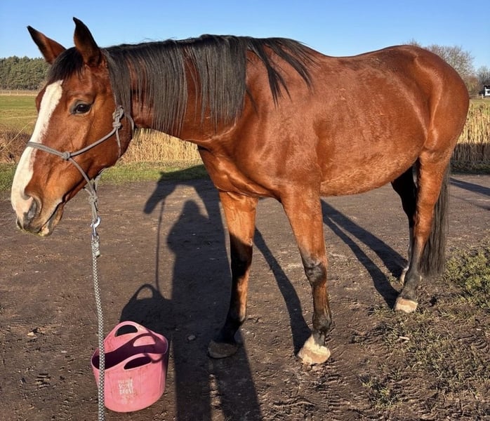 Con gran pesar, tengo que separarme de mi yegua. Ella siempre quiere complacer, trabaja muy bien, necesita mucho movimiento, tiene pasos muy bonitos y un salto excelente. Aún así, necesita un jinete que le dé seguridad y que pueda leerla bien, ya que si alguien se muestra inseguro sobre ella o algo no le gusta, a veces muestra su descontento con un cabeceo. Le gusta probar límites, pero en cuanto nota que la persona no se deja impresionar, vuelve a centrarse y trabaja de maravilla. Lamentablemente, no he sabido entender su carácter, por eso quiero darla en adopción. A largo plazo, simplemente pasa demasiado tiempo conmigo; ella necesita movimiento y trabajo regular. Está montada (se puede montar en todos los niveles de equitación, con buena aceptación, en el lateral, en el paso, etc.), conoce lo básico, ha sido montada en campo, puede actuar como yegua de compañía, y trabaja muy bien en la mano, tanto en la clínica veterinaria como con el herrero, con un carácter muy noble. Dispone de un examen clínico completo, incluyendo radiografías, sus dientes están recién revisados, ha recibido tratamiento osteopático regular, ha sido revisada por el herrero periódicamente y ha sido desparasitad regularmente. ¡Vídeos de monta disponibles y se enviarán a quienes muestren interés!