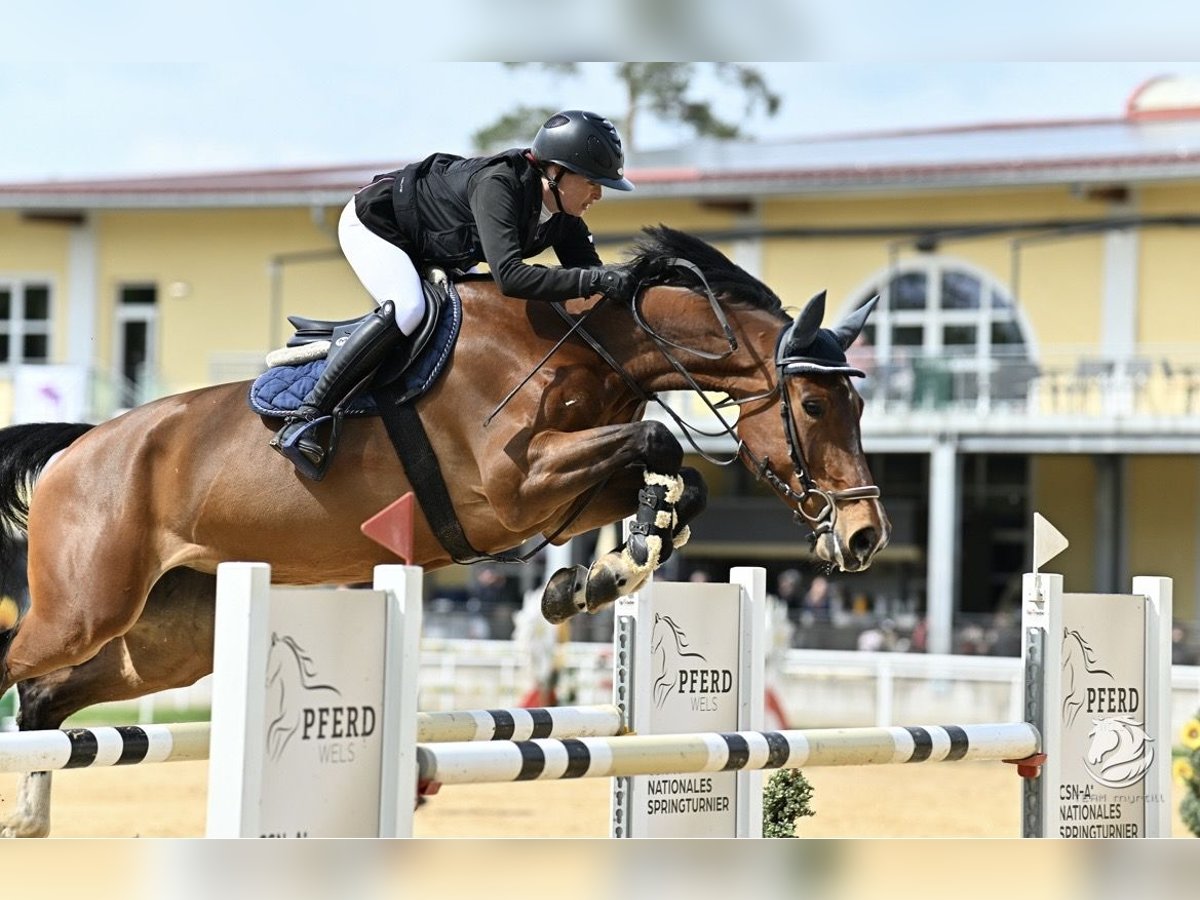 For sale is a approximately 16.1 hh, 9-year-old mare directly from the breeder. This modern, athletic mare is always performance-ready and has plenty of energy. She has won at 125 cm and has numerous placings up to 130 cm at international competitions. Thanks to her good attitude and ability, she is also suitable as an amateur horse. Please call for more information.