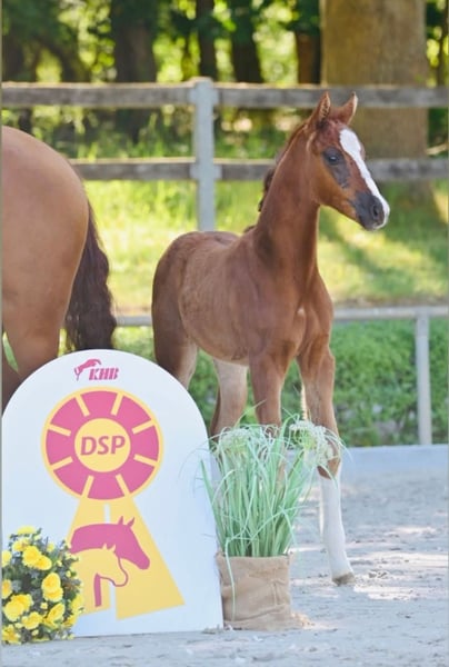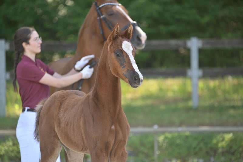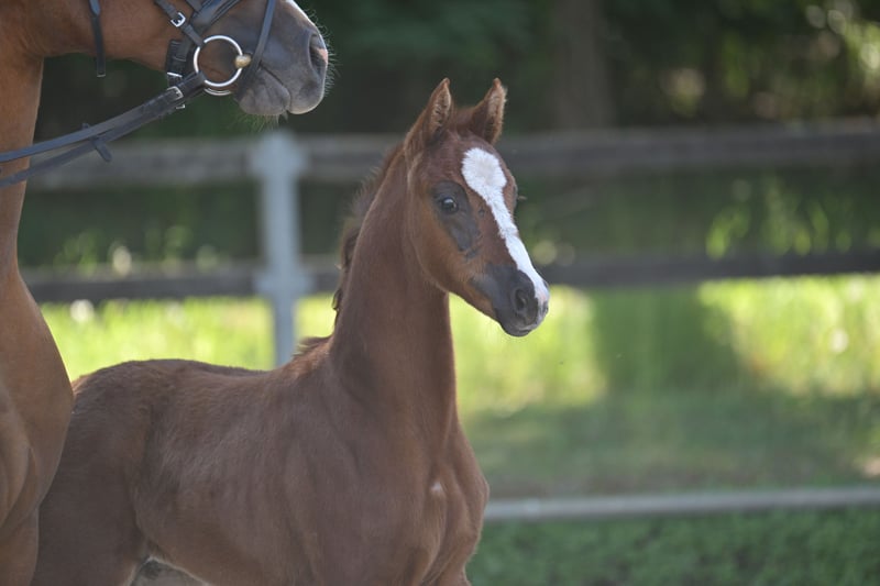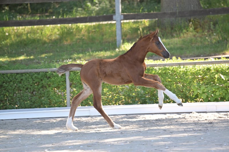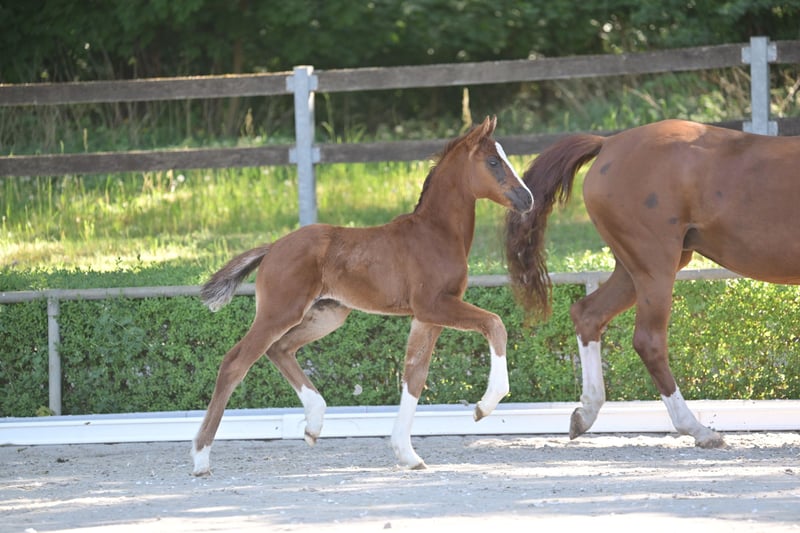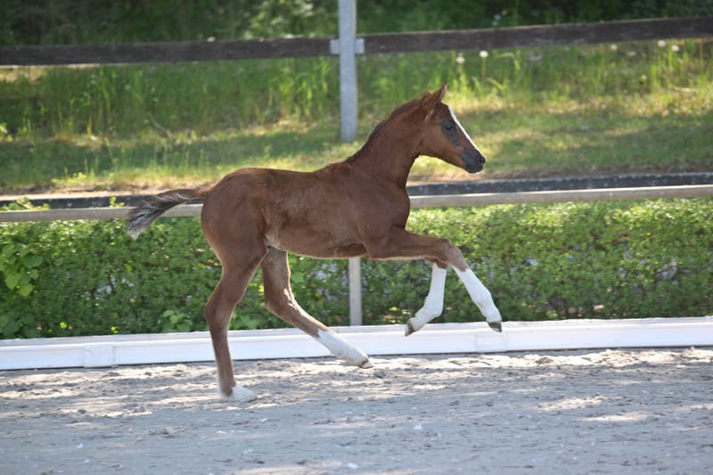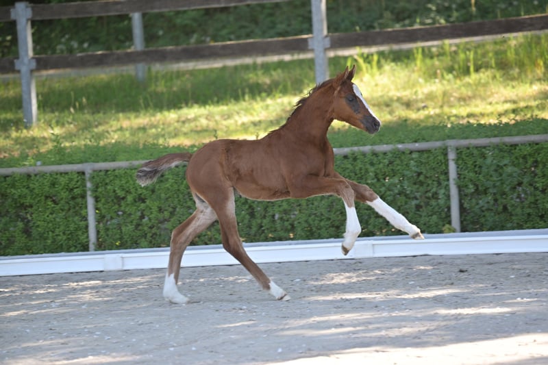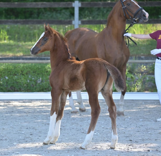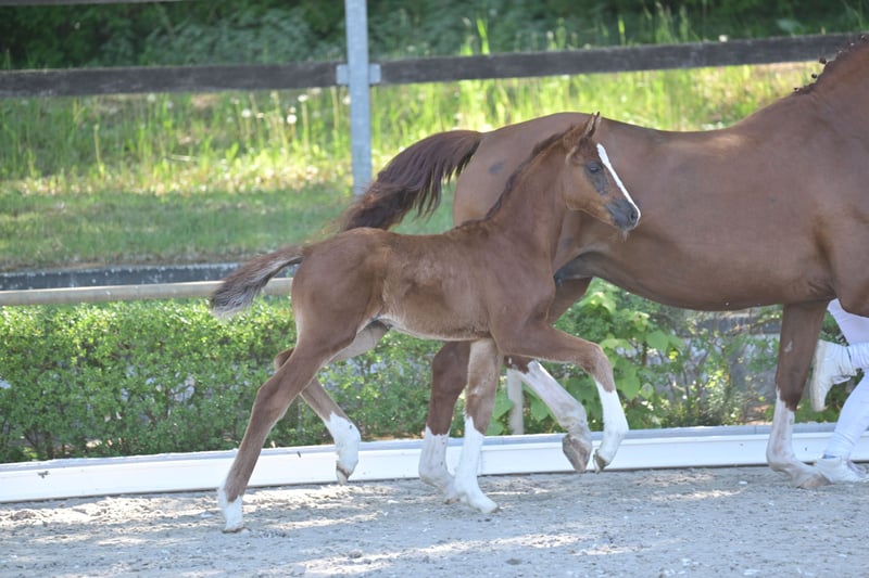 Beautiful filly with great movements. Qualification for the foal championship. Full sister Blümchen S was sold as a foal at auction for €18,000 in 2022. For serious inquiries and further questions, mobile 0151/59885377.