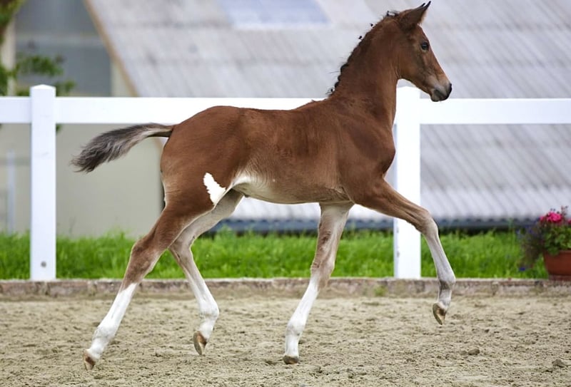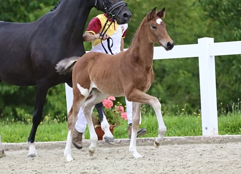 Zum Verkauf steht ein besonders charmantes Stutfohlen, das sofort ins Auge fällt und das nicht nur wegen ihres auffälligen Flecks an der Hinterhand, sondern auch wegen ihres freundlichen und zutraulichen Wesens. Sie begeistert durch Vertrauen zum Menschen und ein bewegungsstarkes, elegantes Auftreten. Sie ist eine Tochter des Oldenburger Hengstes Viva Vitalis OLD, der dieses Jahr das Bundeschampionat der sechsjährigen Dressurpferde in Warendorf mit der herausragenden Endnote von 8,96 gewann. Die Mutterlinie führt auf De Janeiro zurück und vereint ausgezeichnete Eigenschaften in Typ, Bewegungsqualität und Rittigkeit. Dies zeigte das Fohlen auch bei ihrer Teilnahme am Fohlenchampionat. Dieses Stutfohlen bietet ideale Voraussetzungen für Sport oder Zucht und wird durch ihr besonderes Auftreten und ihren liebevollen Charakter garantiert zum Blickfang. Besichtigungen sind nach Absprache möglich.