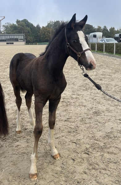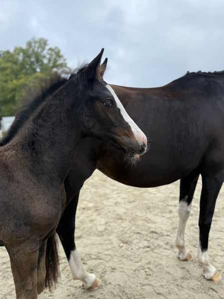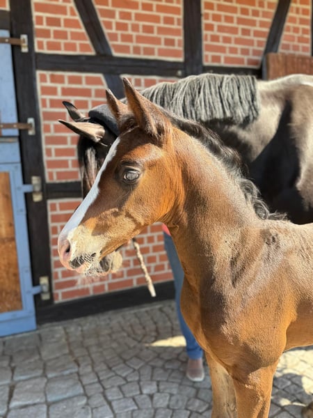 Auffälliges, typvolles Hengstfohlen aus sportlich interessanter Anpaarung Am 11. Juli 2025 geboren, überzeugt dieses moderne, korrekt aufgebaute Fohlen bereits heute mit kraftvollem Bewegungsablauf, sportlicher Aufmachung und sehr auffälliger Zeichnung. Vater: Bon Esprit (Gestüt Schönweide) – vielversprechender Junghengst mit exzellentem Interieur, drei überdurchschnittlichen Grundgangarten und hohem sportlichen Potenzial. Muttervater: Goldberg (Vitalis x San Remo) – international anerkannter Vererber, bekannt für Rittigkeit, Leistungsbereitschaft und Ausstrahlung. Dieses Hengstfohlen besticht durch seinen modernen Typ mit guter Oberlinie und korrektem Fundament • bewegungsstark mit viel Elastizität und Schulterfreiheit • optisch deutlich am Großvater Goldberg orientiert • menschenbezogen, unkompliziert im täglichen Umgang • schmiede- und verladefromm Interessant für • Sport: Dank seiner Abstammung und Bewegungsqualität ein aussichtsreicher Kandidat für die Dressurbahn mit Perspektive für höhere Klassen. • Zucht: Interessante Blutführung (Bon Esprit x Goldberg), die Typ, Leistungsbereitschaft und moderne Reitpferdequalität verbindet.