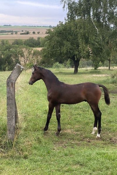 Dieses edel aufgemachte Hengstfohlen überzeugt auf ganzer Linie: Mit seinem maskulinen Ausdruck, dem modernen, langebeinigen Format und einem korrekten, tragfähigen Fundament vereint er alles, was ein zukünftiges Dressurpferd mitbringen sollte. Seine hervorragende Bewegungsqualität – kraftvoll, taktsicher und elastisch – macht ihn zu einem echten Hingucker auf jedem Platz. Besonders bemerkenswert ist auch sein Charakter: Selbstbewusst, freundlich und dem Menschen zugewandt, zeigt er sich im täglichen Umgang sehr kooperativ und neugierig – beste Anlagen für eine partnerschaftliche Ausbildung. Der Vater Decurio, gefeierter Kör- und HLP-Sieger, begeistert mit enormer Rittigkeit, Dynamik in der Bewegung und Vererbungskraft. Auf der Mutterseite sorgt der Trakehner-Elitehengst Cadeau für edle Reitpferdepoints, Klarheit im Typ und einen verlässlichen, leistungsstarken Charakter. Decurius ist im Umgang freundlich und dem Menschen zugewandt. Er zeigt sich verspielt, aufgeweckt und neugierig. Wer einen Partner mit Zukunft sucht, der ist bei diesem jungen Mann richtig. Sportliches Potenzial, klarer Kopf und Trakehnerchic. Fohlenprämierung: Typ 9,0 Exterieur 8,0 Bewegung 8,0 Bei Fragen gern per WhatsApp 0177 4460 510 Mail: Syho76@web.de Besichtigung vor Ort möglich.