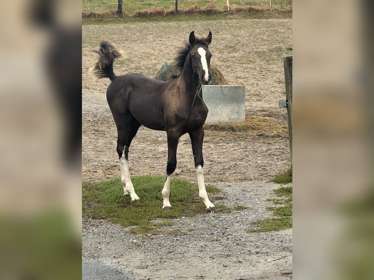 Lord Frechdachs AB is an exceptionally well-behaved, double-talented, and very resilient young horse. His sire is our homebred Holsteiner premium stallion and HLP winner, Lord Fernando AB, who impresses with outstanding rideability and strong aptitude for both dressage and jumping. His grandsire, Lamborghini Boy, was also double-talented (show jumping S, dressage). Like all his offspring, he is a characterful and trustworthy horse. Escarda, the dam of Lord Fernando AB, was successful up to S level in show jumping. The dam of Lord Frechdachs AB, Diabola, a De Niro daughter, has two full brothers who competed successfully up to S level and international competitions. His full brother, Lord of Life AB, was recently backed here at the stud and convinced his owners completely as a very rideable, social, performance-oriented, double-talented, and always fun leisure horse for the whole family. Lord Frechdachs AB is raised appropriately in a herd with older, experienced companions and seven other geldings of various ages. Thanks to the Bavarian low mountain landscape, with diverse terrain and a 24/7 summer pasture that also serves as a food source, all our horses have the best conditions for healthy growth. Naturally, all of them have mastered the foal basics and have already been transported in the trailer to the pasture. They all handled this excellently.