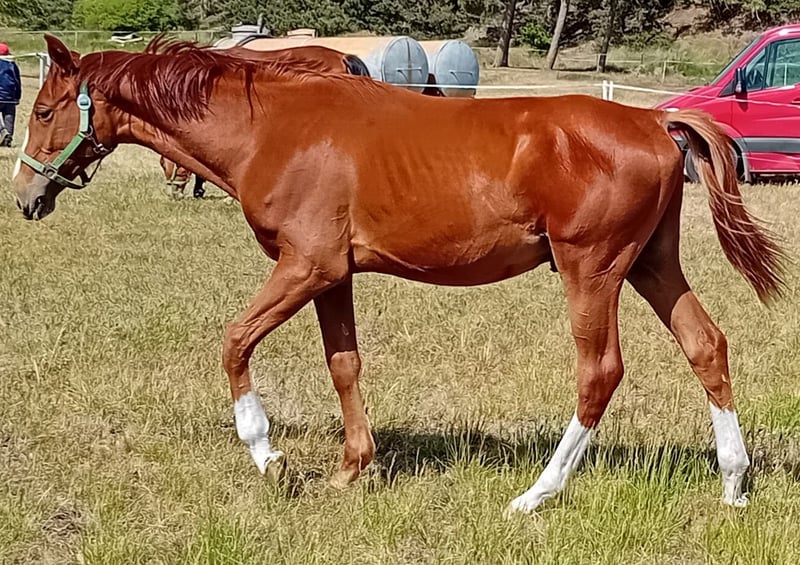 Nous proposons à la vente un poulain prometteur et bien typé en veste alezane chic. Avec une présentation expressive, "Diado" se présente décontracté et léger dans ses mouvements. Il est très sociable, maîtrise l'ABC du poulain et est doté de beaucoup de charme. Il se présente de manière élégante et sportive et offre, grâce à son ascendance, les meilleures conditions de base pour le saut d'obstacles de haut niveau ; peut-être même intéressant pour l'élevage d'étalons. Son père DIATHAGO (par Diamant De Semilly - Carthago - Stakkato - Grannus) est un athlète de saut d'obstacles typé et un fils important du légendaire Diamant de Semilly, qui se distingue par ses excellentes qualités de saut, son élasticité et son bascule. Il a ainsi déjà convaincu lors du test de 70 jours à Neustadt (Dosse) avec une note finale de 8,6 axée sur le saut et s'est montré exceptionnel au saut en liberté (9,0). Son père Diamant de Semilly a été champion du monde en 2002 et vice-champion d'Europe en 2003 sous la selle d'Eric Levallois et compte 71 fils approuvés et 191 descendants couronnés de succès en épreuves de niveau S. Il a également obtenu le titre de champion du monde de saut d'obstacles en 2003. DIATHAGO a remporté des succès sous la selle de Marcus Ehning (5e place au CSI4* de Valkenswaad et vainqueur du classement mondial à Oslo) et a connu auparavant de grands succès sous la selle de Lara Weber dans des épreuves internationales jusqu'à S*** et s'est classé en 2020 au CSI2* de Riesenbeck. En 2019, le couple a remporté le championnat de Westphalie. Jusqu'à présent, l'étalon s'était classé troisième du championnat de Bavière LVM pour chevaux d'obstacle de six et sept ans en 2017 sous la selle de Jens Goldfuß. Il s'est également classé dans la petite finale du championnat du monde des chevaux de saut d'obstacles de cinq ans. Les descendants de DIATHAGO séduisent par leur sportivité et leur chic. Il a notamment été le poulain vainqueur de Warendorf en 2018. Entre-temps, ses premiers descendants ont atteint le niveau difficile et peuvent se targuer de classements S internationaux. DIATHAGO est le demi-frère du fils de PILOT, PILOTHAGO, approuvé en 2012. Plus d'informations sous : https://www.landgestuet.nrw.de/zucht/unsere-hengste/hengst/diathago/ Données sur la souche maternelle : La mère de Diado est issue de la légendaire lignée Landgraf et a elle-même connu le succès sur les parcours jusqu'à 1,35m. En raison de ses performances sportives, elle a été récompensée par la prime DSP. Diado est né le 22.04.2024 et est sur le point d'être sevré. Si vous êtes intéressé ou si vous souhaitez de plus amples informations, n'hésitez pas à nous contacter.