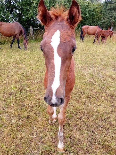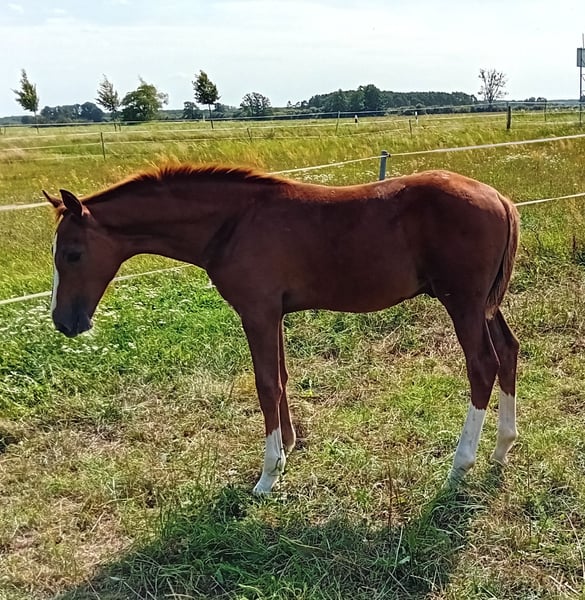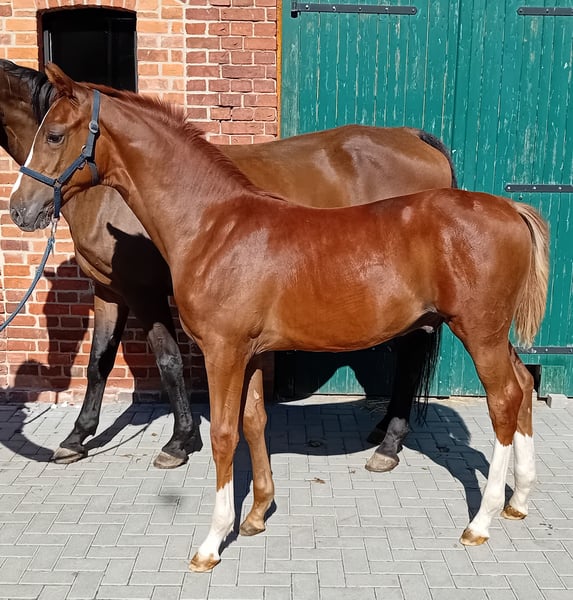 For sale is a promising, typey colt in a chic chestnut jacket. With an expressive appearance, "Diado" presents himself relaxed and light-footed in movement. He is very sociable, has mastered the foal ABC and has a lot of charm. He has an elegant and sporty appearance and, due to his pedigree, offers the best basic prerequisites for high-level show jumping; perhaps even interesting for stallion breeding. Sire DIATHAGO (by Diamant De Semilly - Carthago - Stakkato - Grannus) is a typey top show jumper and an important son of the legendary Diamant de Semilly, who stands out with his excellent jumping manner, elasticity and bascule. He already impressed in the 70-day test in Neustadt (Dosse) with a jumping-oriented final score of 8.6 and was outstanding in free jumping (9.0). Sire Diamant de Semilly was World Champion under Eric Levallois in 2002 and Vice European Champion in 2003 and can point to 71 licensed sons and 191 S-successful offspring. DIATHAGO has been successful under the saddle of Marcus Ehning (5th place in the CSI4* in Valkenswaad and victorious in the World Ranking Jumping in Oslo) and was previously highly successful under Lara Weber in international show jumping competitions up to advanced (S***) level and placed in the CSI2* in Riesenbeck in 2020. The pair won the Westphalian Championships in 2019. To date, the stallion has placed third in the LVM Bavarian Championships for six and seven-year-old show jumpers under Jens Goldfuß in 2017. He also placed in the small final at the World Championships for five-year-old show jumpers. DIATHAGO's offspring inspire with their athleticism and elegance. Among others, he produced the champion jumping foal in Warendorf in 2018. His first offspring have now reached advanced level and can point to international advanced (S) level placings. DIATHAGO is half-brother to the PILOT son PILOTHAGO, who was licensed in 2012. Further information under: https://www.landgestuet.nrw.de/zucht/unsere-hengste/hengst/diathago/ Information on the parent strain: Diado's dam comes from the legendary Landgraf line and was herself successful on the show jumping course up to 1.35 m. She was awarded the DSP premium for her athletic performance. Diado was born on 22.04.2024 and is about to be weaned. If you are interested or require further information, please do not hesitate to contact us.
