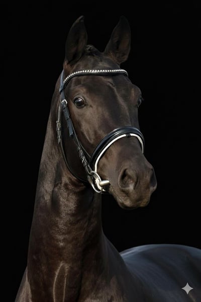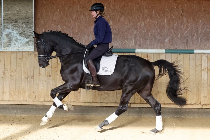 For sale is the exceptional DSP stallion V-Mann, a noble black gelding without markings who impresses not only with his elegant appearance but, above all, with his quality. He completed his 50-day test with outstanding scores, including an 8.0 in walk, a 9.0 for willingness to perform, and no score below 7.5. V-Mann consistently demonstrates high performance potential, possesses excellent basic gaits, and has a clear, uncomplicated temperament. He is both transport- and farrier-safe. His pedigree further enhances his appeal: Vivanero x Pashma (El Mariachi ox) from the renowned Neustädter P-family, around Poetin II – a combination of noble bloodlines and proven dressage performance, making him a very promising candidate for the big arena. Standing approximately 170 cm tall and with his modern, expressive presence, this stallion offers ideal prerequisites for a successful sporting career.