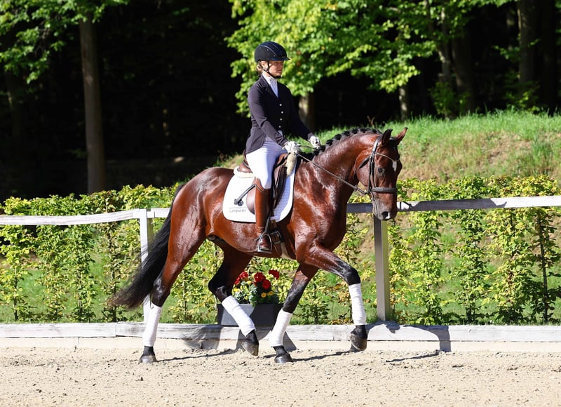 Hier geht's zur Kollektion und Online-Registrierung: https://auktion.pzvbw.de/auctions MwSt. 19 % Typcharmanter Junghengst, der bereits mehrfacher Sieger in Reitpferdeprüfungen ist. Charming Youngster, who was winner in two riding horse classes. M: Dr. L MM: Van Gogh v. Vancour (int. Spr. S); Conquistador 38 v. Consotho (Spr. S);Connara v. Calido I (Spr. S) MMM: Festival L v. Favorit ASK (Spr. L), Lill v. Levistan (Spr. S), Queraz v. Quaterback (Dr. M); Betty 272 v. Belissimo M (Dr. M), Dadiva Desperada v. Desperados (Dr. M)