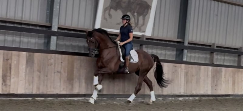 Un hermoso potro joven. Comenzó su entrenamiento bajo la silla algo tarde, pero ha alcanzado un buen nivel en su entrenamiento. Aún está algo verde en su desarrollo, por lo que no es adecuado para un jinete principiante. Es un caballo ideal para alguien que quiera seguir educándolo y perfeccionándolo. Disponibles radiografías recientes. Se puede ver en Hunsel, Países Bajos.