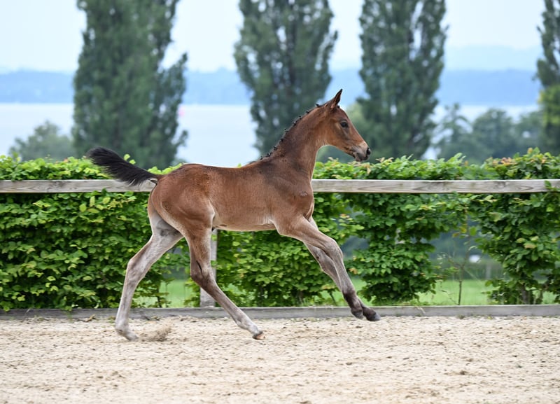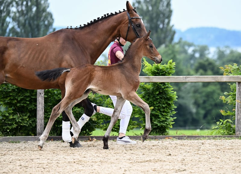 Cornettos Pedigree zeigt eine sehr sprungvolle Mischung aus bekannten Vorfahren. Sein Muttervater ist der bekannte Now or Never und sein Vater Corallino mit Cassini I im Blut. Seine Hinterhand ist sehr gut gewinkelt, dies spricht für eine gute Mechanik als Erwachsener. Sein gerader, langer Rücken spricht für eine gute Sattellage. Cornettos Körperbau konnte mit einem kräftigen Fundament in der Wertung mit 8 Punkten hervorstechen. Seine Beine stehen senkrecht unter dem Körper was eine taktvolle Bewegung aufweist. Seine raumgreifende Galoppade wurde im Alter von nur 6 Wochen mit 7,5 bewertet. Sein Trab ist noch nicht ganz Takt rein, aber dies wird fleißig geübt. Sein Typ wurde mit einer guten 8,0 notiert. Insgesamt hat er auf der Fohlenschau am 16.06. ein freudiges Ergebnis von 38,5 Punkten erreicht. Vor neuen Situationen zeigt er sich interessiert und nicht schreckhaft. Beim Fohlen ABC ist er sehr lernwillig. Seine interessierten, warmen Augen zeigen eine Gutmütigkeit und Intelligenz auf, welche bis in die Seele blicken. Er ist Halfter führig, verladefähig, mit Wasser abspritzen sowie das Hufaufheben klappt ebenfalls schon. An Kinder, Autos, Traktoren, Hunde und Menschen ist er gewöhnt. Sein Vater Corallino ist ein Schimmel mit 171 cm Stockmaß, hat ein vielversprechenden Pedigree mit Cornet Obolensky/Diamant de Semilly sowie Cassini I und Cantus. Er überzeugt mit hohen Ritttigkeitswerten, guter Balance und kraftvollen Bewegungsabläufen, vor allem im Sprung. Der 2017 geborene Hengst hat bereits erfolgreiche Springprüfungen der Klassen A* bis M absolviert, wo er seine Qualität und sein Potenzial für höhere Aufgaben zeigte. Seine Mutter Nobel Champ hat Springprüfungen in den Klassen A** und L absolviert. Nobel Champs Vater Now or Never hat zahlreiche Springprüfungen erfolgreich gemeistert, und seine Nachkommenzuchtwerte beim Springen (145) gehört noch im hohen Alter von 24 Jahren zu den Top-5%. Ihr Großvater ist der bekannte Voltoire, welcher zahlreiche Springturniere absolvierte, dazu zählt auch sein Sieg im Großen Preis von Berlin. Aktuell wächst er mit einem zweiten Fohlen im Herdenverband auf. Abgegeben wird er frühestens ab 6 Monaten, frühestens ab Nov. Gerne kann er in München besichtigt werden. Über eine persönliche Nachricht freuen wir uns sehr.