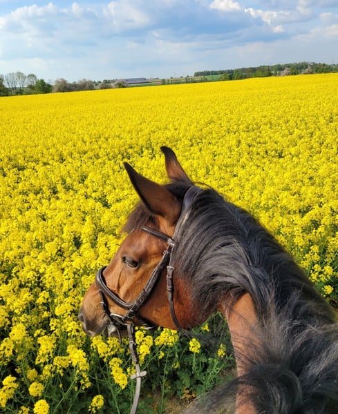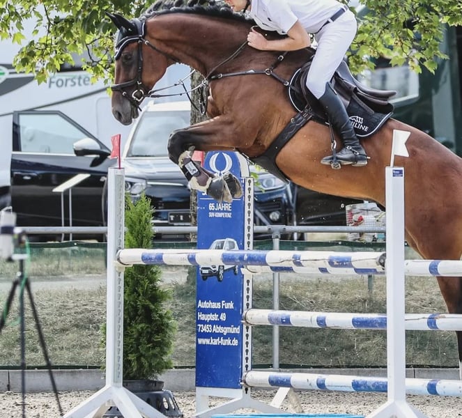 Aus Zeitmangel muss ich mich schweren Herzens von meinem selbst gezogen, 10 jährigen Wallach Amir trennen. Er stammt ab von Acordelli (Birkhof). Er hat ein Stm. von ca. 1,73m und ist kräftig gebaut. Aufgrund von meinem Job mit vielen Auslandsaufenthalten konnte ich Amir in den letzten 2 Jahren nicht mehr regelmäßig reiten. Zum rumstehen ist er einfach zu schade und er liebt Aufmerksamkeit die ich ihm leider nicht mehr geben kann. Ich habe ihn vielfach L-Springen platziert. Er läuft auch schön in der Dressur. Ich habe mit ihm mein großes Reitabzeichen gemacht, also eine A-Dressur. Er geht sehr gerne ins Gelände und liebt stundenlange Ausritte! Ich reite ihn oft im Gelände um junge Pferde als Handpferd mitzunehmen. Regelmäßig Springen soll er nicht mehr. Er ist sehr brav und verschmust. Er ist reiterlich eher gemütlich. Er ist wie ein Hunter zu reiten. Immer gleichmäßig, schaut sich nichts an, nicht stark, kein maulen etc. Er hat am Sprung noch nicht gestoppt oder ist vorbei gelaufen. Es können zahlreiche Videos auf Rimondo angesehen werden unter dem Namen: Amir D. Amir steht im Offenstall und ist sehr verträglich. Ich wünsche mir für ihn einen Offenstall oder Aktivstall. Er ist natürlich Schmiede-, Verlade- und Tierarztfrom. Da er bei mir geboren ist, kann ich zu 100% sagen, dass er noch nie schlechte Erfahrungen gemacht hat. Er wird aus Zeitmangel seit 2 Jahren wenig geritten. Er hat Röntgenbilder von Juli 2025 von den hinteren Gliedmaßen, ohne Befund. Gerne nähere Infos bei ernstahftem Interesse. Kein zur Verfügung stellen.