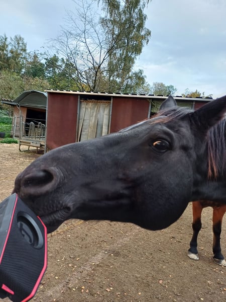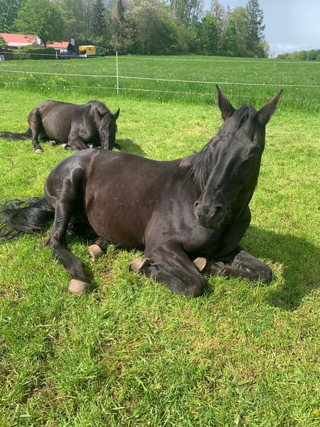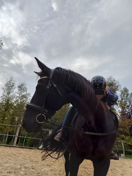 Menny ist ein 16-jähriger außergewöhnlich schöner und harmonischer Rappwallach (V: Trakehner Ovaro) der auf unserem Ponyhof seine Aufgabe nicht findet. Er braucht mehr Aufmerksamkeit und möchte viel öfter ins Gelände gehen oder auf dem Platz beschäftigt werden (Dressur, Stangenarbeit, Bodenarbeit, Longieren,…) Menny ist aufgrund seiner schwungvollen Bewegungen und seines großrahmigen Galopps kein Anfängerpferd. Bis auf eine witterungsbedingte Erkältung durch das Leben in der robusten Ponyherde war er hier seit 8 Jahren immer fit. Aktuell wird er im Winterhalbjahr im Offenstall und auf der Weide eingedeckt. Er läuft barhuf, kennt aber auch Eisen oder Hufschuhe. Er hat drei gute Grundgangarten und geht problemlos allein ins Gelände. Menny sucht seinen Herzensmenschen, der ihm mehr Zeit widmen kann. Für uns ist eine artgerechte Haltung und ein fairer Umgang mit dem Pferd letztendlich wichtiger als der Preis. Zubehör kann mit übernommen werden. Um Reittourismus zu vermeiden, nehmen wir für das Probereiten 40€.