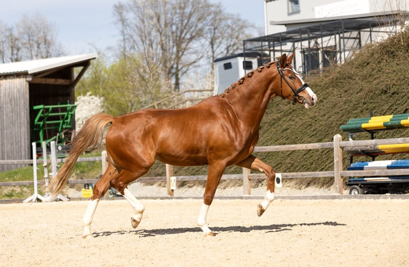 Dressur-Nachwuchspferd aus 2022 Dieser ausdrucksstarke und vielversprechende Dressur-Nachwuchs-Wallach besticht durch seine Optik (4 x weiß), sein Wesen und seine beeindruckende Bewegung. Dexter wurde bei uns schonend angeritten und wird altersgemäß weiter von Amateur ausgebildet. Er ist fein in der Hand und überzeugt unterm Reiter mit perfekter Anlehnung, dabei ist er stets motiviert und lernwillig. Er hat keinerlei Unarten wie Buckeln oder Steigen. Dexter hat in 2025 seine erste Reitpferdeprüfung erfolgreich gemeistert und ist für den Dressursport bestens geeignet. Dexters Halbschwester Bella Ducati (aus der gleichen Mutterstute) konnte sich in 2025 bei den 6 -jährigen Dressurpferden mit der Note 8,5 für das Bundeschampionat in Warendorf qualifizieren. Er ist sehr menschenbezogen, schmiede- und verladefromm. Ideal für Reiter, die ein talentiertes Pferd suchen, ohne Unarten, das sowohl im Training als auch auf dem Turnierplatz glänzt. Dieser 4-jährige Wallach ist so ungewöhnlich angenehm und leicht zu reiten, da kann selbst mancher 6-jähriger nicht mithalten. Dexter ist wirklich von Amateuren gut zu reiten. Wichtige Hinweise: • gute Röntgenbilder inkl. Rücken liegen vor. Ein Probereiten ist jederzeit möglich, eine Reithalle ist vorhanden. Bei Interesse oder für weitere Informationen stehe ich gerne zur Verfügung: Telefon: 08531 3102826 oder 0171 6087030 -