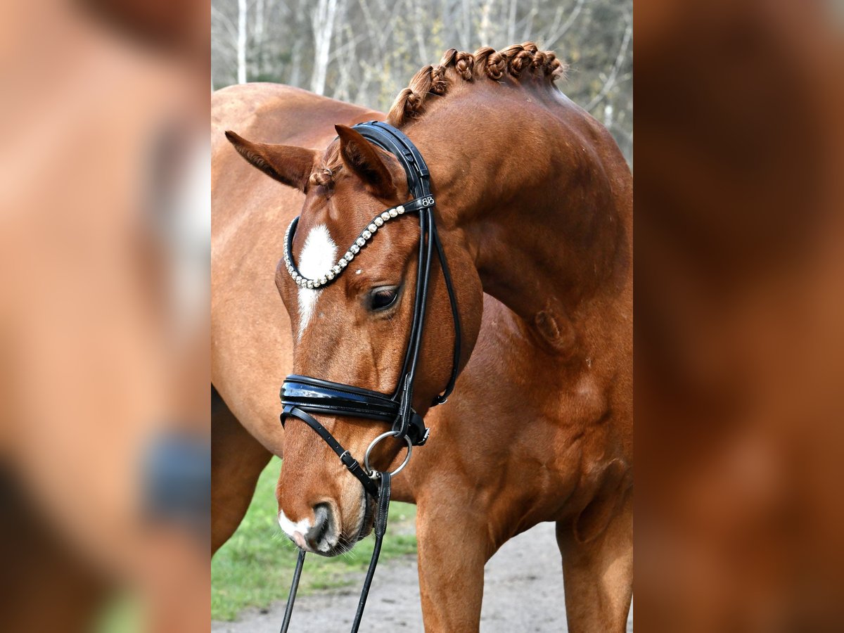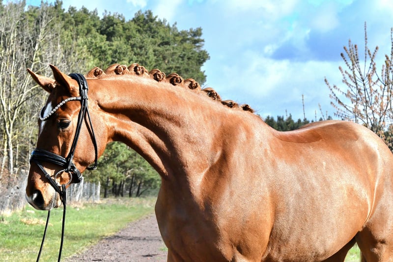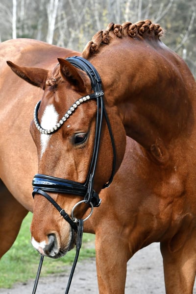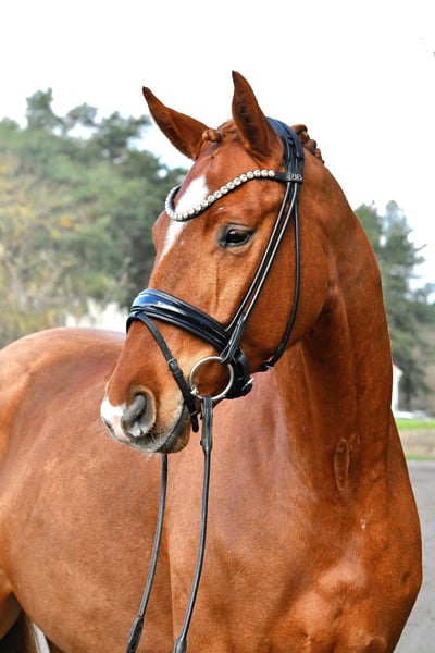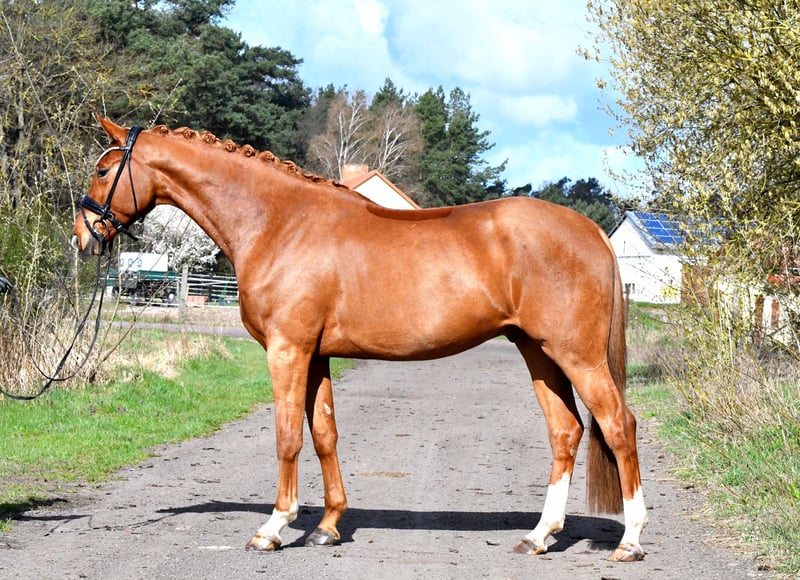 Direkt vom Züchter präsentiert sich dieser groß aufgemachte Fuchswallach des Danone I . Im Spätherbst schonend angeritten, konnte " Dankeschön " in Ruhe reifen und ist jetzt startklar für die ersten Turnierstarts. Leicht in der Anlehnung und an den Hilfen, verspricht er ein tolles Nachwuchspferd für den Dressursport zu werden- auch für den Amateur! Geht tägl. mit anderen Wallachen auf Weide, auch hier sehr unkompliziert. Nicht schreckhaft oder zuckig! Ein aktueller, guter Röntgentüv aus März 26' inkl. Rücken liegt natürlich vor. Vereinbaren sie gerne einen Termin zum Kennenlernen und Probereiten!