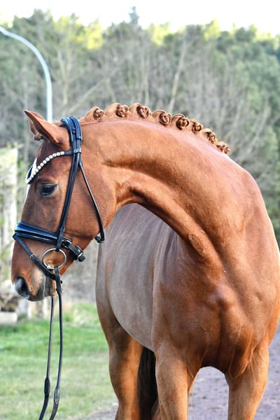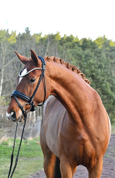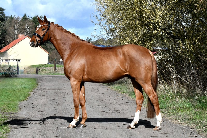 Prosto od hodowcy prezentuje się ten duży, rudy ogier po Danone I. Już pod koniec jesieni został delikatnie zaczął jeździć, dzięki czemu „Dziękuję” mógł spokojnie dojrzeć i jest teraz gotowy na pierwsze starty w konkursach. Lekko reaguje na ujeżdżenie i pomoc, co zapowiada go jako świetnego młodego konia do sportu ujeżdżeniowego – również dla amatorów! Codziennie razem z innymi ogierami wypasa się na pastwisku, również bardzo spokojny i bezproblemowy. Nie jest strachliwy ani nerwowy! Aktualny, dobry przegląd rentgenowski z marca 2026 roku, w tym odcinek grzbietu, jest dostępny. Chętnie umówimy się na spotkanie i jazdę próbną!
