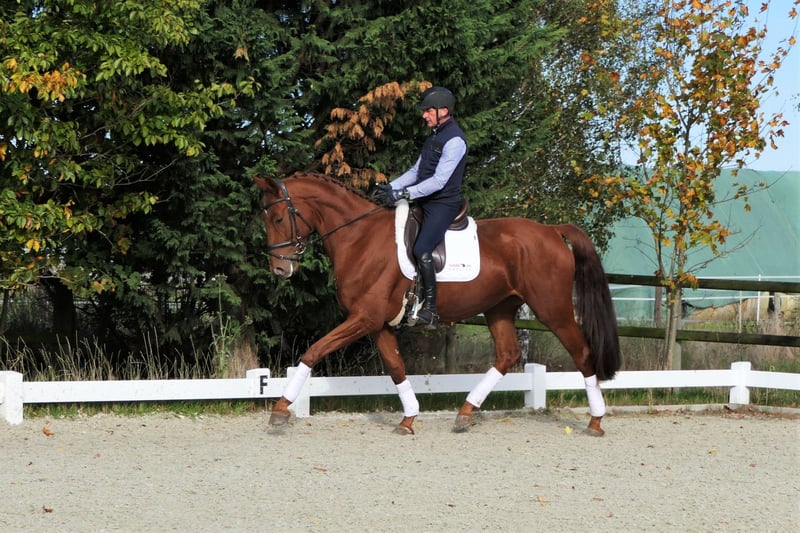 From loving upbringing, a handsome, large-framed chestnut gelding by Belantis II is for sale. This young gelding impresses not only with his expressive appearance and lovable personality but also with his rideability and willingness to learn. He is motivated under saddle, responds delicately to aids, and has three good basic gaits. Healthy, with recent good X-rays, ready for further training.