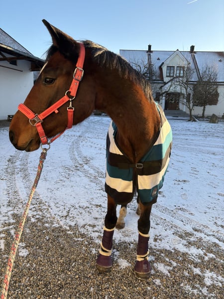 For sale: German Sport Horse – Ideal for leisure and sport We are offering a beautiful dark bay gelding, born in 2021. Standing at 16.1 hh, he combines classic sporthorse qualities with plenty of charm. This versatile leisure partner is well-prepared for riding life and demonstrates exceptional reliability and friendliness both in handling and in the field. Castano is comfortable with rider weights in walk and trot, both on the riding arena and in open terrain. X-rays of the front legs show no findings. The price is negotiable for quick decision-makers. He is sure to become a wonderful partner someday! Pedigree: Dia Corrado x Ramiro's Match x Wertschatz I have owned him since 2022 and have prepared him to the best of my ability for riding. Castano is a affectionate and gentle gelding. He is familiar with all farm noises, whether it’s a brush cutter or a front loader, and remains completely calm in all situations. Currently, he is kept in a pasture with a herd of geldings, where he enjoys playing and socializing. He gets along well with other horses and has always been easy to integrate into new groups. Castano is a very people-oriented horse who enjoys learning new things, whether it's performing a Flehmen on command or the horse yoga pose. He has a lot of fun during training. If you are interested or have further questions, please feel free to contact me. Arrange a viewing appointment and see for yourself what a fantastic horse he is!