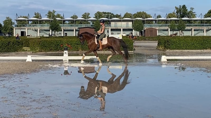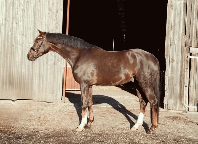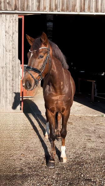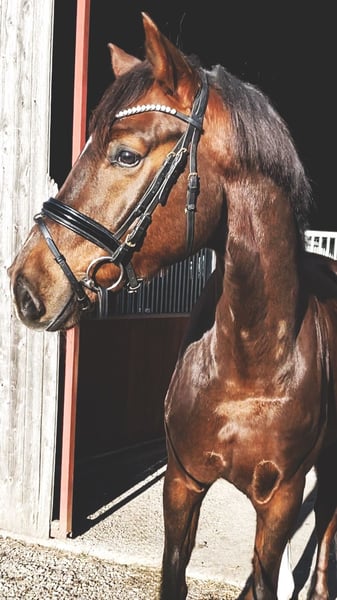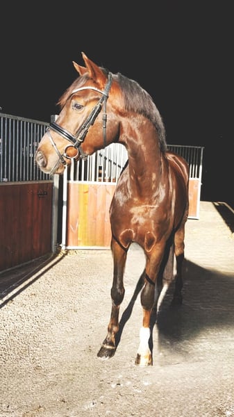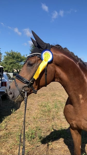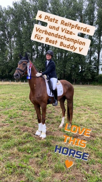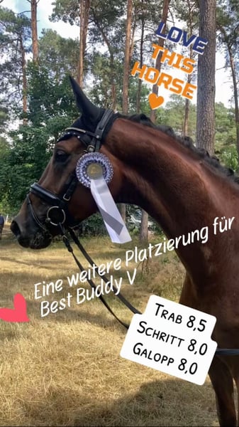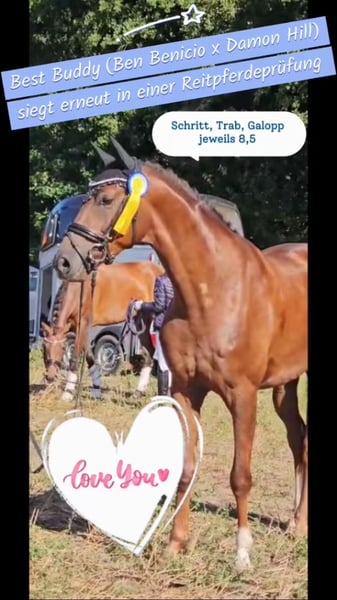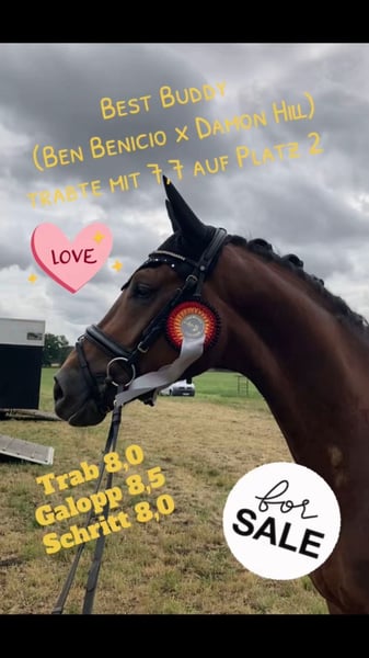 Traumpferd gesucht? Hier kommt Best Buddy. Der Name ist hier tatsächlich Programm. In toller Dunkelfuchsfarbe und ganz schicker Optik kommt hier, mit großem Bewegungsablauf, ein echter Kumpel daher. Mit einer Größe von 1.68m ist er super als Umsteigerpferd geeignet, jedoch auch nicht zu klein für den etwas größeren Reiter. „Benni“ stammt ab von Ben Benicio aus einer Damon Hill Mutter und ist ein echtes Charakterpferd. Immer ehrlich und zuverlässig. Ob im Umgang, wo meine 10 jährige Tochter ihn führen und putzen kann, ob alleine mit ihm aufs Turnier fahren oder auch unter dem Sattel. Er möchte nichts falsch machen und ist stets auf der Seite des Reiters. Dies konnte er im letzten Jahr auch schon auf einigen Turnieren unter Beweis stellen und konnte sich in Serie in Reitpferdeprüfungen hoch platzieren und gewinnen. Hier gab es durchweg Noten in den GGA von 8,0-8,5. Dies sicherte ihm auch die Qualifizierung zum Bundeschampionat und den Titel des Vize Verbandschampions Brandenburg-Anhalts. Aus seiner Familie stammen ebenfalls die Grand Prix erfolgreichen Pferde DSP Dauphin, sowie Diamond Head und andere S*** erfolgreiche Pferde. Hier wächst ein ganz toller Sportpartner für das große Viereck und gleichzeitig ein ganz toller Kumpel zum kuscheln, Spaß haben und Quatsch machen heran. Hier noch ein weiteres Video: https://youtu.be/4WbfD32WLBg?si=mYfsCAIG8e_f0Kxi