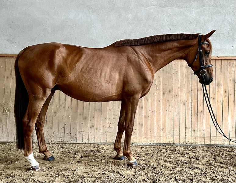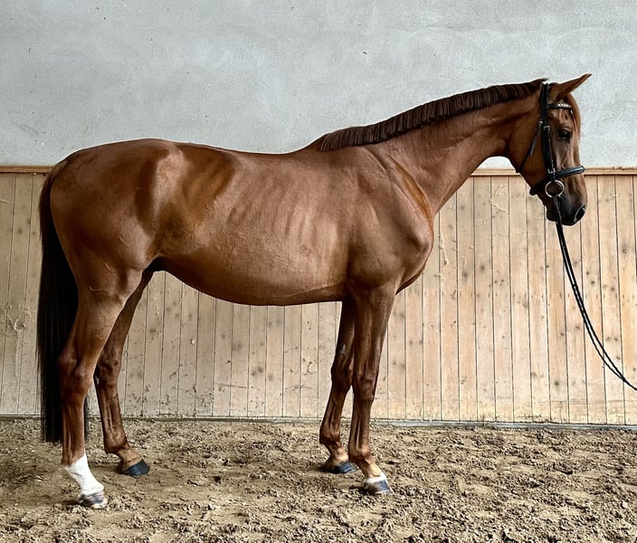 This 4-year-old gelding impresses with an exceptional work attitude. He has good basic gaits and always aims to please his rider. He is currently being ridden several times a week in dressage and also jumps. He is familiar with trail riding and is well-behaved when loading. The gelding was raised with us and has never been ill. He is currently turned out with a second gelding during the day and stabled at night. The health certificate (AKU) shows no findings and can be sent at any time. We can envision his future either in sport or leisure riding. Due to his cautious nature and good overview when jumping, he is also suitable for eventing. Further information gladly via WhatsApp.