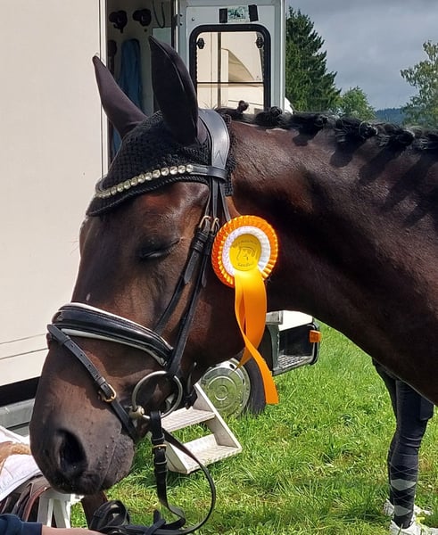 For sale is a beautiful, sensitive 6-year-old gelding by Silvano (Rubinstein I) out of a Kaiserkult mother, directly from the breeder. Sympathique PSL impresses with three very good basic gaits and a character of gold. He is completely uncomplicated to handle. He was gently backed as a 4-year-old and has already been successfully presented at competitions. Currently, he is winning and placing in dressage horse tests at the L level. Lessons at the M level are currently being prepared. Due to his rideability, he is also suitable as a top amateur horse, preferably with young horse experience. X-rays from 2024 are available. He is being sold well below value due to a secondary finding. Trial rides can be arranged at any time by appointment in the form of a riding lesson, which will then be deducted from the sale price.