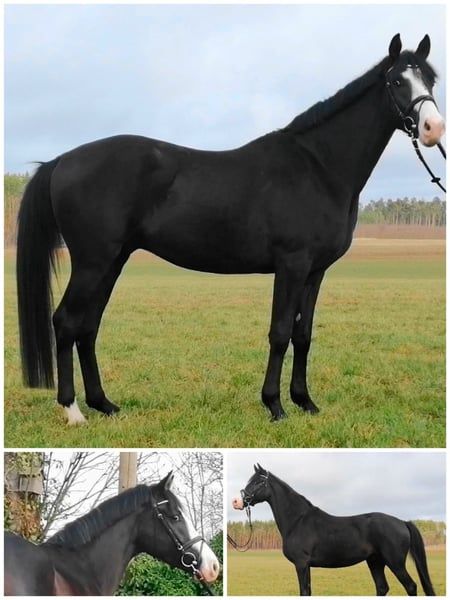 Our Bugatti SB is a real eye-catcher - beautiful, striking, and guaranteed to be memorable! Bugatti was born with us, raised around people, and was sent for professional training to the Brandenburg State Stud in Neustadt/Dosse. There, he was gently and age-appropriately started under saddle at the end of 2023. He is a little overachiever, absolutely uncomplicated, and impresses with his relaxed demeanor. He demonstrates three very good basic gaits and has already completed a few small jumps in the free jumping arena, showing great awareness throughout. Since he was born and raised on a farm, machines such as tractors, yard loaders, mini excavators, as well as leaf blowers and circular saws are part of his everyday life. He is open-minded and observes the happenings with complete calmness. Handling mares is not a problem - in the stable, his box was situated between two mares, and his mother (with foal) was directly opposite. He is currently in a mixed stable with individual boxes. His father, the Neustadt stallion Blanc Pain/T., has been successful in dressage at the S level. In 2021, Blanc Pain was awarded the title of Elite Candidate by the Trakehner Association due to his above-average performance in sports and the quality of his first two foal crops! In 2024, a son of Blanc Pain was named the champion stallion at the Trakehner licensing in Neumünster! The full brother of Bugatti's mother, "Lord Capri SB," has already achieved his first S-level placements in dressage with his owner, which we are very proud of. Due to his presence and very good basic gaits, we can also imagine Bugatti excelling in driving sports, whether in single harness or as part of a pair.