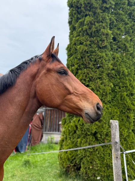 Erlkönig ist ein 6-jähriger Wallach von Emanuel (Escolar – Lauries Crusador xx) x Finest x Desperados mit vielversprechender Abstammung. Er überzeugt mit einem guten Schritt, einem sehr schwungvollen Trab sowie einem ausbalancierten Galopp. Aktuell ist er angeritten und hat ein Stockmaß von ca. 1,80 m. Erlkönig ist ein freundliches, menschenbezogenes Pferd mit großem Potenzial für den gehobenen Sport. Aufgrund von Zeitmangel konnte er bisher leider nicht entsprechend gefördert werden, weshalb ich mir für ihn einen Besitzer wünsche, der ihn altersgerecht weiter ausbildet und sein Talent gezielt fördert. Er ist sehr sozialverträglich und steht derzeit problemlos im Offenstall zusammen mit einer Stute. Im Umgang zeigt er sich stets brav und angenehm – sowohl gegenüber Menschen als auch anderen Pferden. Besonders hervorzuheben ist seine Geländesicherheit: Erlkönig ist absolut unerschrocken und kennt bereits Verkehr, landwirtschaftliche Maschinen wie Bulldogs sowie Bagger und Baustellen. Auch auf fremden Anlagen zeigt er sich stets übersichtlich, souverän und jederzeit gut handelbar. Der Verkauf fällt mir nicht leicht und erfolgt ausschließlich aufgrund veränderter Lebensumstände. Daher wünsche ich mir für Erlkönig ein liebevolles Zuhause, in dem er die Aufmerksamkeit und Förderung erhält, die er verdient. Videos können gerne auf Anfrage versendet werden. Ein Probereiten ist nach Absprache selbstverständlich möglich. Für das Probereiten werden 25 € berechnet, die beim Kauf verrechnet werden.