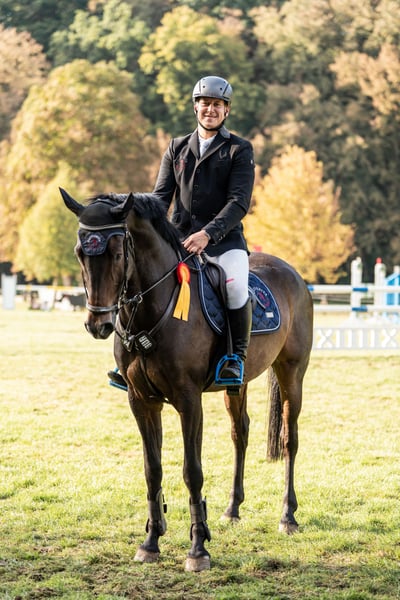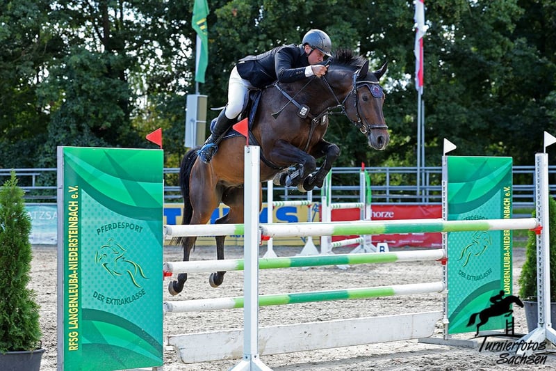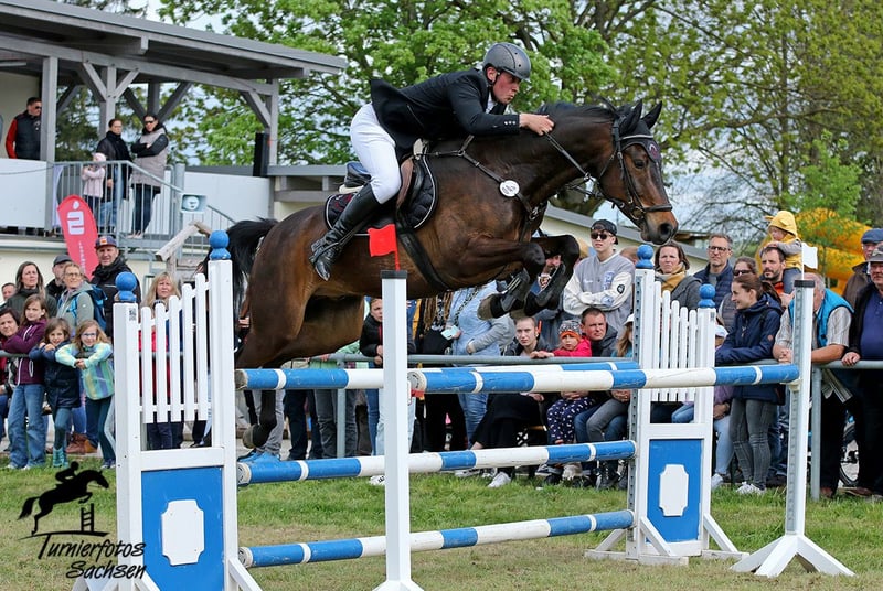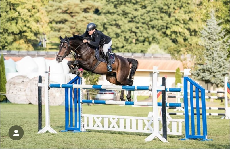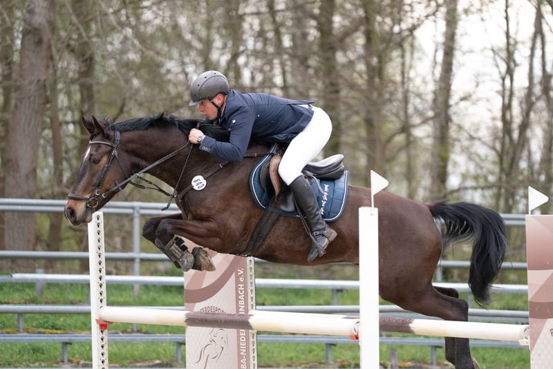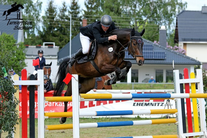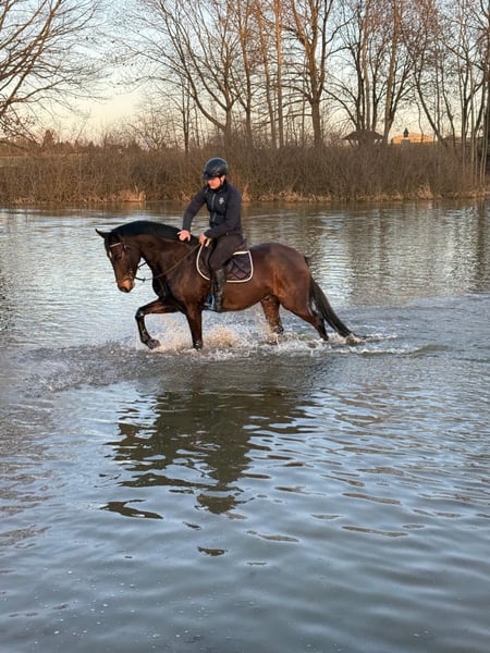 Rondus is an 8-year-old, approximately 16.1 hh bay gelding from a top sport lineage. He has achieved numerous successes and wins in show jumping up to class M, thanks to his talent, heart, and plenty of "GO." He is being sold directly by the breeder and has had no previous owners. Rondus is farrier- and loading-friendly, accustomed to daily turnout in paddock or pasture, and regularly participates in group turnout several times a week. He also freely goes out alone in the terrain, including roads, woods, and lakes. As a 7-year-old, he made a name for himself on the East German show jumping circuit, consistently placing in class M competitions and securing many victories thanks to his natural speed. Rondus has won open jumping classes at 120 cm and 125 cm, was successful in the young horse class with a score of 8.5, and even managed to place in 130 cm classes as a 7-year-old. He has been carefully developed and has never shown any physical issues. A recent, thorough veterinary check with a clean TÜV is available. This is not a desperate sale; the horse will only be sold to a stable where daily turnout in paddock and/or pasture is guaranteed!