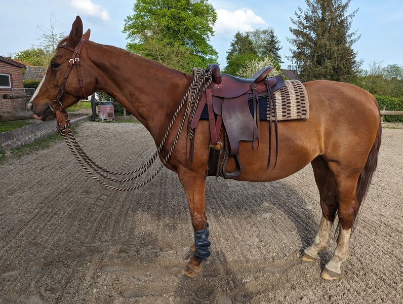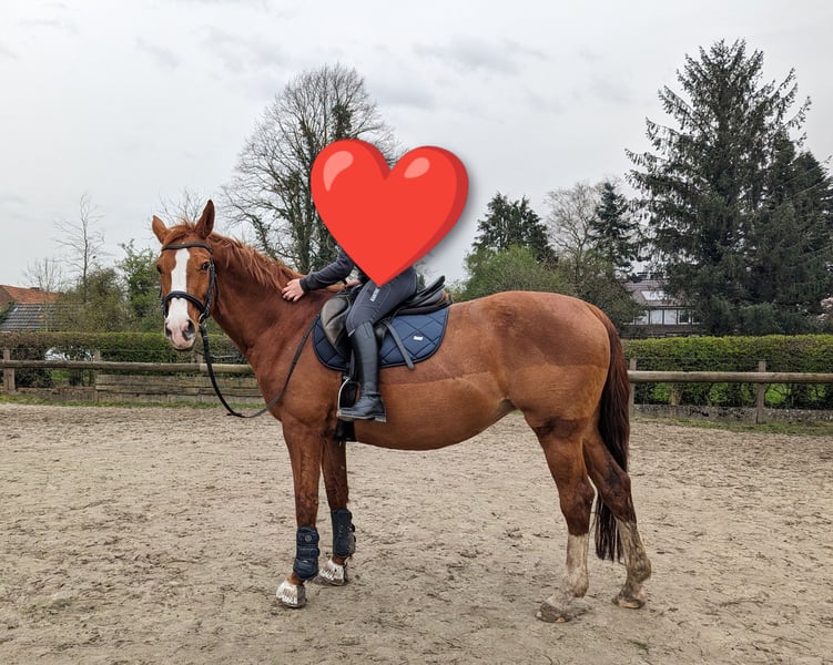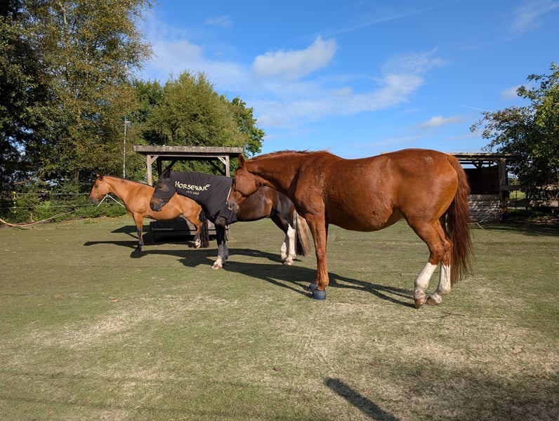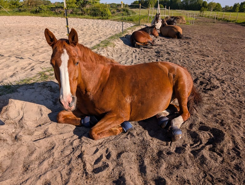 Im Auftrag der Besitzer steht hier eine 16-jährige, ca. 1,62m große Warmblut-Stute zur Vermittlung. Sunny kam vor zwei Jahren aus Sachsen zu uns, da sie in ihrer Heimat Atemwegsbeschwerden entwickelte. Dank der guten Nordseeluft und unserer optimierten Haltung war sie bereits kurz nach ihrer Ankunft ohne Beschwerden oder Einschränkungen, benötigt keine Medikamente und muss nicht inhalieren. Damit sie auch langfristig ohne Atemwegsbeschwerden ihr Leben genießen kann, haben sich ihre Besitzer nun dazu entschlossen, Sunny hier an der See an einen geeigneten Menschen abzugeben. Sunny ist ein Pferd mit einem Herzen aus purem Gold. Dem Menschen gegenüber ist sie sehr zugewandt und eine richtige Kuschelnase. Im Umgang ist sie gelassen, leicht zu händeln, umsichtig und brav. Sie ist schmiede- und verladefromm, geht unheimlich gerne ins Gelände und hat auch im Straßenverkehr Nerven wie Drahtseile. Sie hat bereits mehreren Anfängern das Reiten beigebracht, ist aber auch mit fortgeschrittenen Reitern motiviert bei der Sache. In der Herde ist sie eher ranghoch, aber auch sozial und fair. Sie ist zwar momentan nicht ganz so gut im Training, befindet sich aber auf einem soliden A-Niveau und hat auch Turniererfahrung in der Vielseitigkeit gesammelt. Sie wird hier jedoch ausdrücklich als reines Freizeitpferd vermittelt. Sunny bringt aber auch ein paar Besonderheiten mit, auf die man Rücksicht nehmen muss. So benötigt sie zwingend einen Vollbeschlag, denn sie hat eine Fehlstellung der Vorderbeine (dadurch „bügelt“ sie etwas) und an den Hinterbeinen sind ihre Fesselgelenke etwas durchtrittig. Mit einem fachgerechten Beschlag (kein orthopädischer Beschlag notwendig) kommt sie aber sehr gut klar. Außerdem muss sie im Sommer immer eine Fliegenmaske tragen, da sie an den Augen sehr empfindlich auf Fliegen reagiert. Und natürlich muss vor allem ihre Haltung allergikergeeignet sein. Bei uns steht sie in einem Offenstall mit 24/7 Weide im Sommer und Heulagefütterung im Winter sowie geeigneter Einstreu. Sunny kann sehr gerne bei uns im Stall in Großheide stehen bleiben, einem Umzug in eine andere, geeignete (Offenstall-)Haltung steht aber auch nichts im Wege. Es gilt Platz vor Preis. Den Besitzern ist der passende Mensch und ein guter Endplatz wichtiger als ein schneller Verkauf. Sunny bringt außerdem ihre umfangreiche Ausrüstung wie Dressur- und Springsattel, Decken und weiteres Zubehör mit. Wenn du auf der Suche nach einem treuen und gelassenen Freizeitpartner bist und etwas Erfahrung mit den oben genannten Besonderheiten mitbringst, dann ist Sunny vielleicht genau die richtige für dich und freut sich, dich kennenzulernen!
